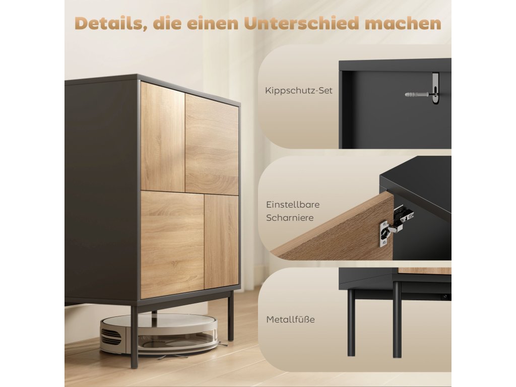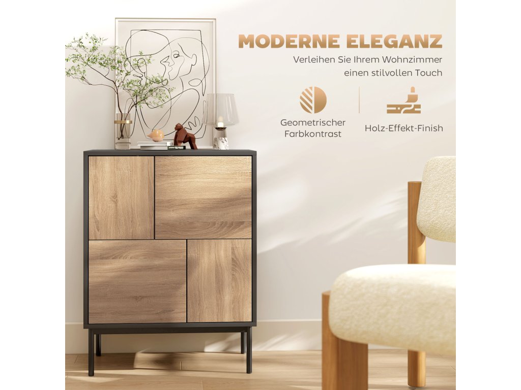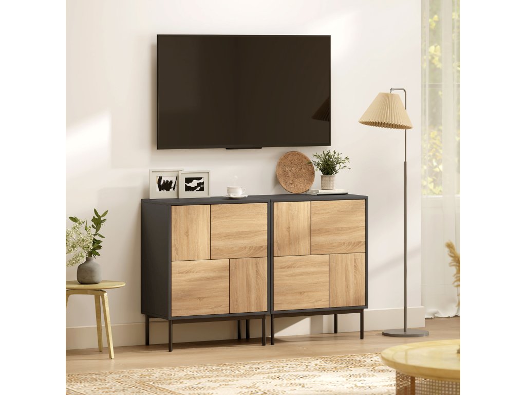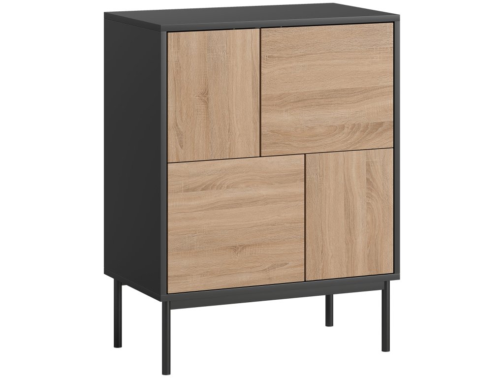 - Moderní akcent: Matně černý korpus a dvířka v přírodním vzhledu dřeva spolu s čistými liniemi a geometrickými panely bez problémů začlení tento příborník do jídelen, vstupních prostor, kanceláří nebo obývacích pokojů