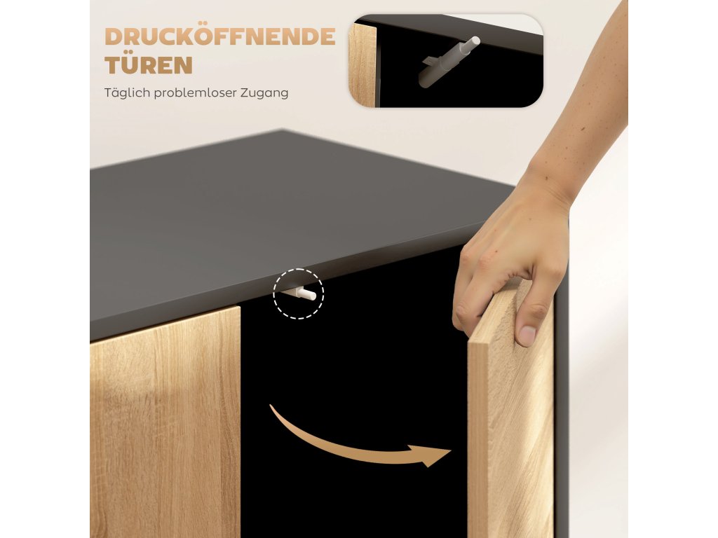 - Přístup bez námahy: Dvířka s funkcí push-to-open usnadňují otevírání příborníku do obývacího pokoje, i když máte plné ruce práce. Nastavitelné panty zaručují, že dvířka jsou vždy dokonale vyrovnaná, a poskytují čisté a dlouhotrvající uložení