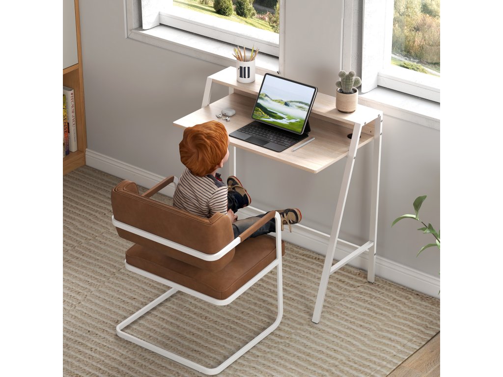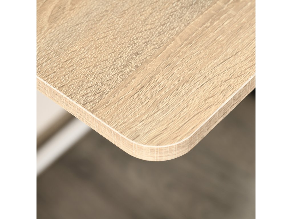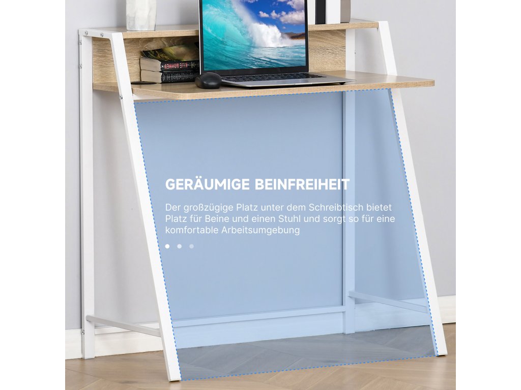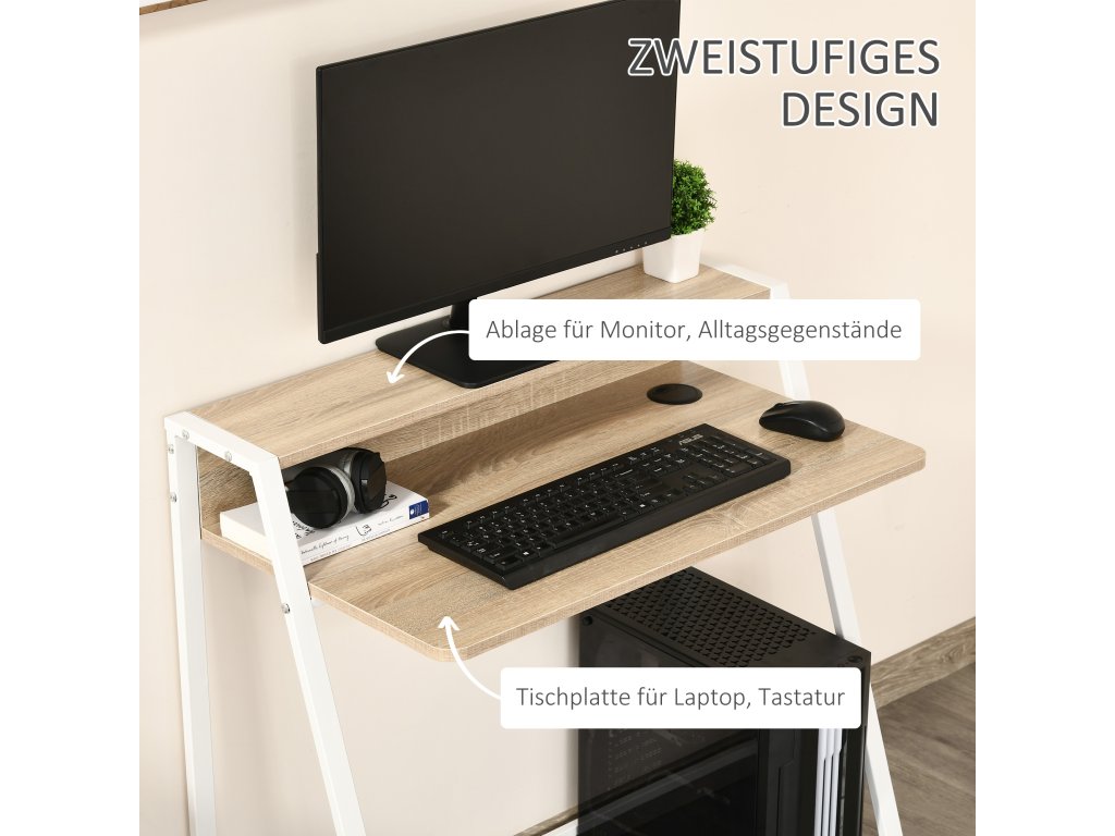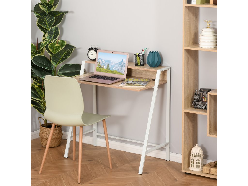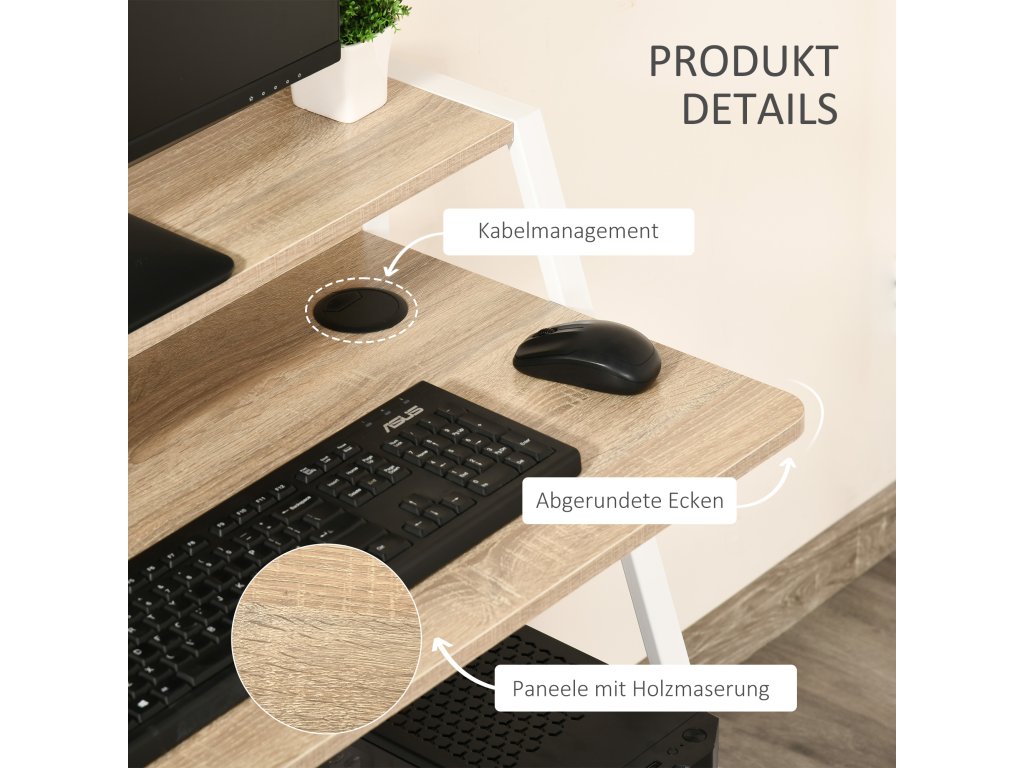 HOMCOM Psací stůl, počítačový stůl s policí a vedením kabelů, moderní stůl s kovovým rámem do pracovny, ložnice, domácí kanceláře, 84 x 45 x 85 cm, bílá+dub