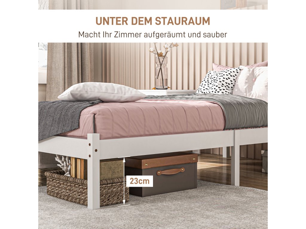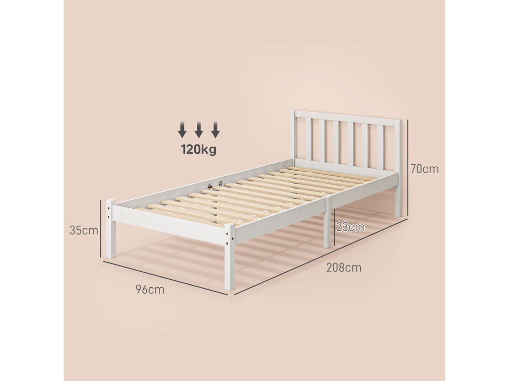 HOMCOM Rám postele pro jednu osobu, čelo a rošt, 26 cm volný prostor pod postelí, borovicové dřevo, 208x96x70 cm, bílý