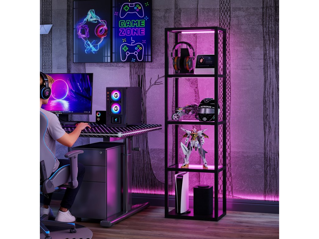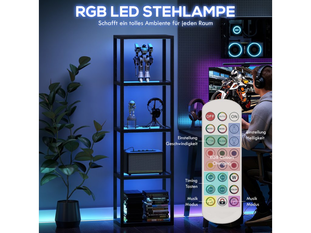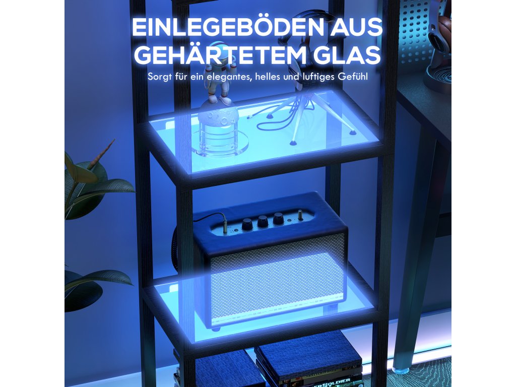 Vadí vám nudný pokoj, který neodráží vaši náladu? Vaše sběratelské předměty zůstávají bez povšimnutí a filmové večery postrádají tu zvláštní jiskru. Tato stojací lampa HOMCOM s poličkami oživí váš pokoj synchronizací barevného světla RGB s hudbou a vytvoří skutečnou atmosféru večírku. Barvy, režimy a jas můžete ovládat pomocí dálkového ovladače. Tři skleněné police stojací lampy jsou nejen praktické, ale také efektně vystaví vaše dekorace.