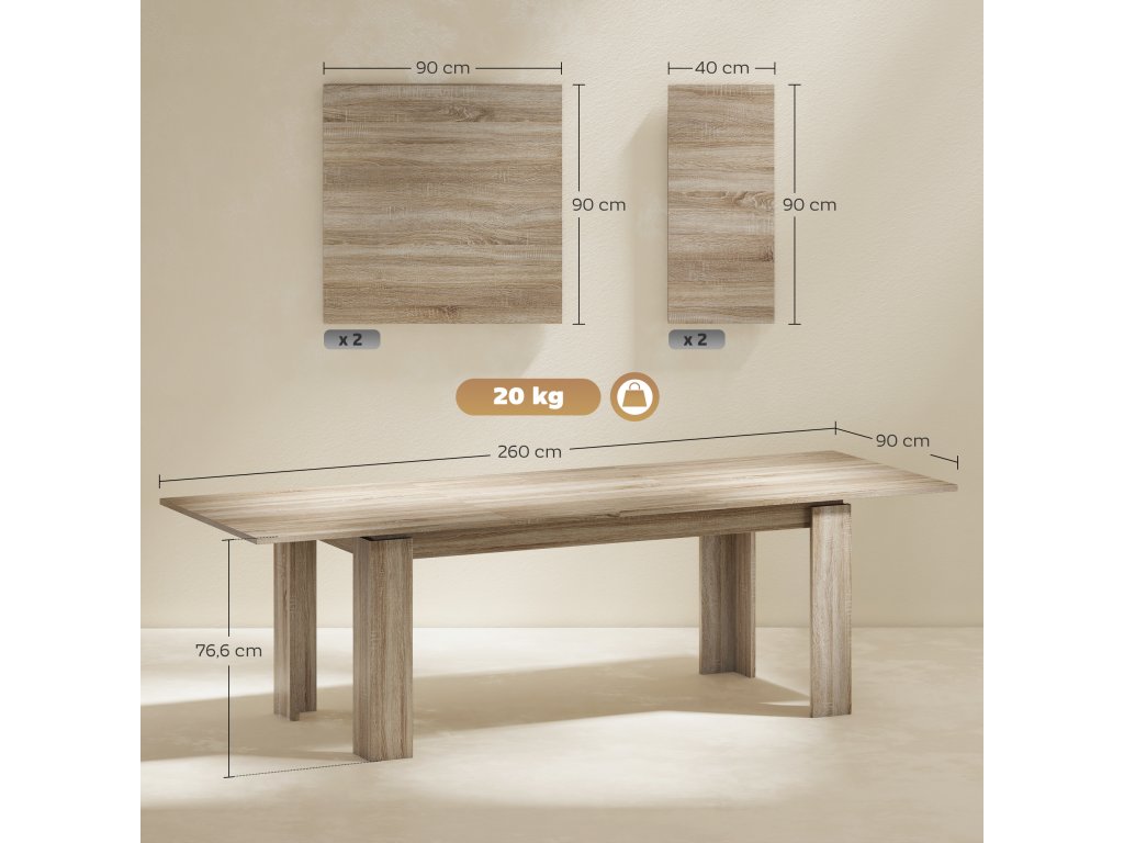 - Rozměry jídelního stolu: Rozšířený rozměr: 260L x 90W x 76,6V cm. Rozměry ve složeném stavu: 220L x 90W x 76,6H cm. Rozměry ve složeném stavu: 180L x 90W x 76,6H cm. Maximální zatížení: 20 kg. Nutná montáž.