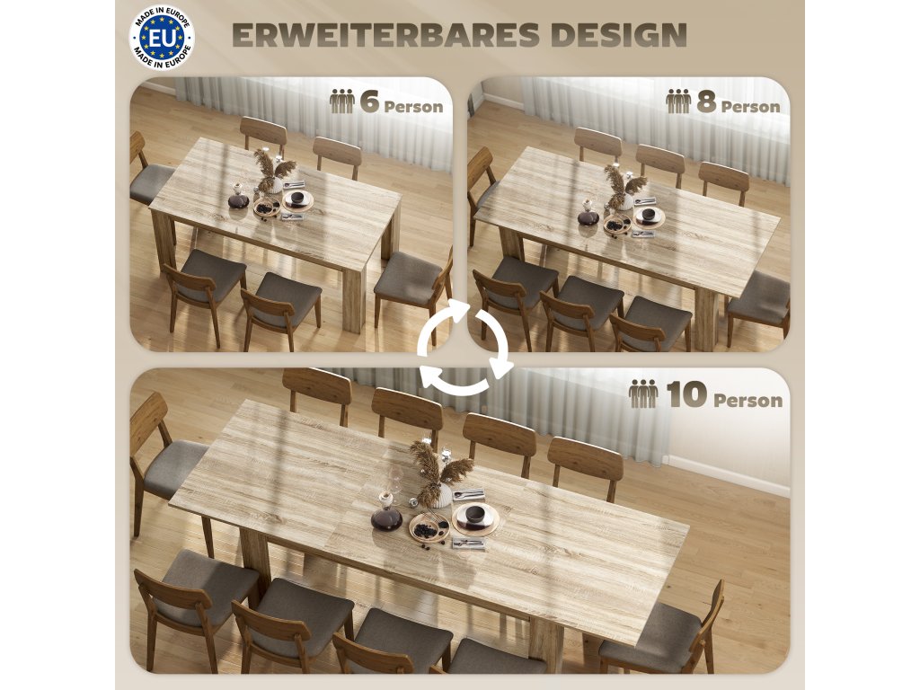 - Snadno rozkládací konstrukce: Praktický motýlkový mechanismus vám umožní rozšířit jídelní plochu během chvilky. Jídelní stůl se zvětší ze 180 cm na 260 cm a nabízí prostor až pro 10 osob - ideální pro velká rodinná jídla nebo společenská setkání.