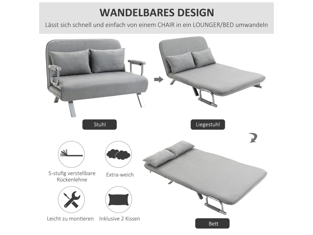 HOMCOM Rozkládací pohovka, rozkládací pohovka pro dva, lůžko pro hosty, včetně 2 polštářů, šedá barva