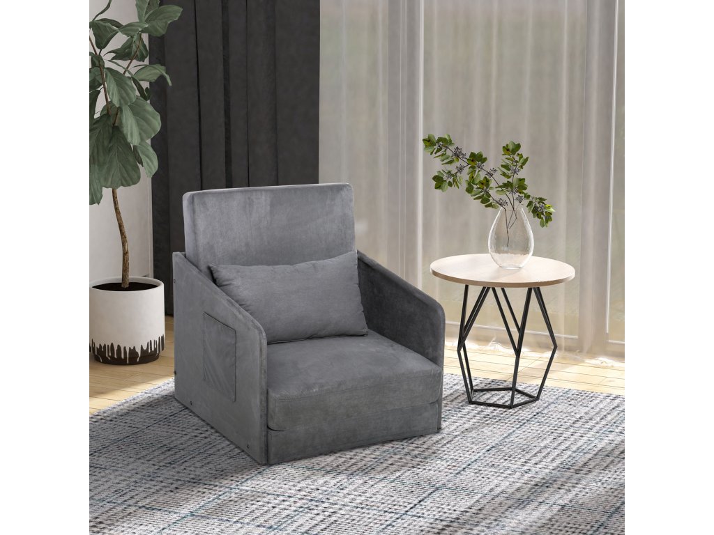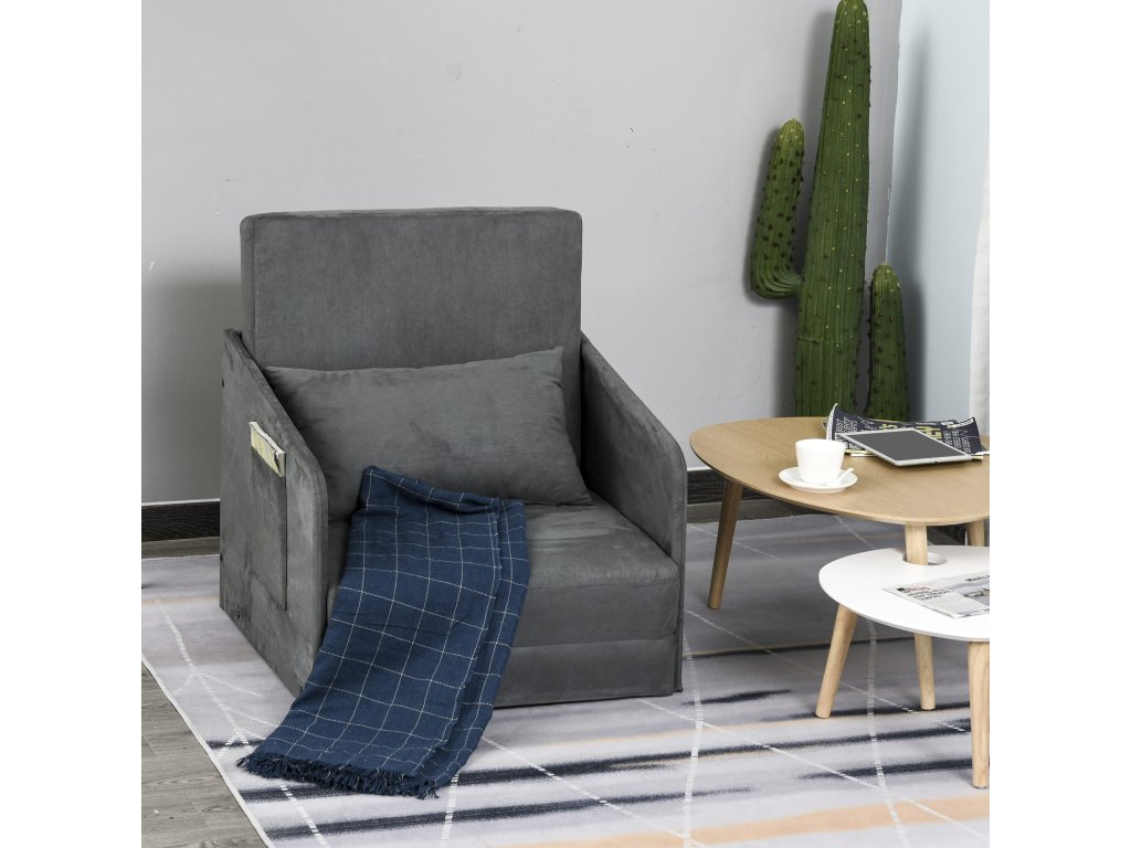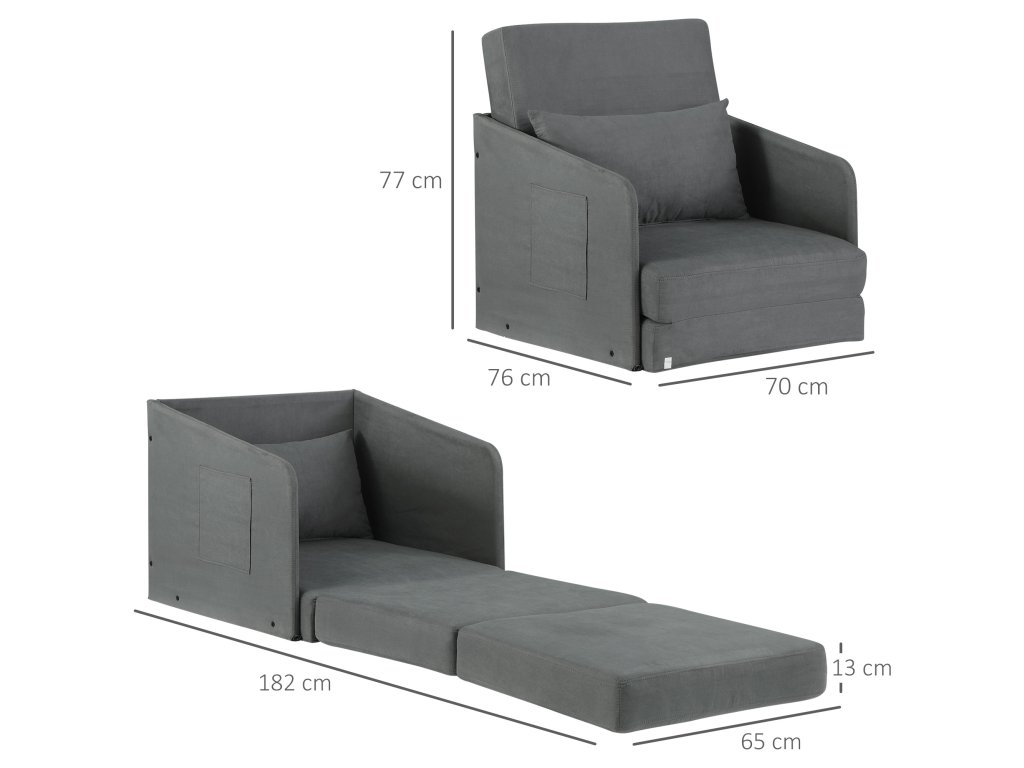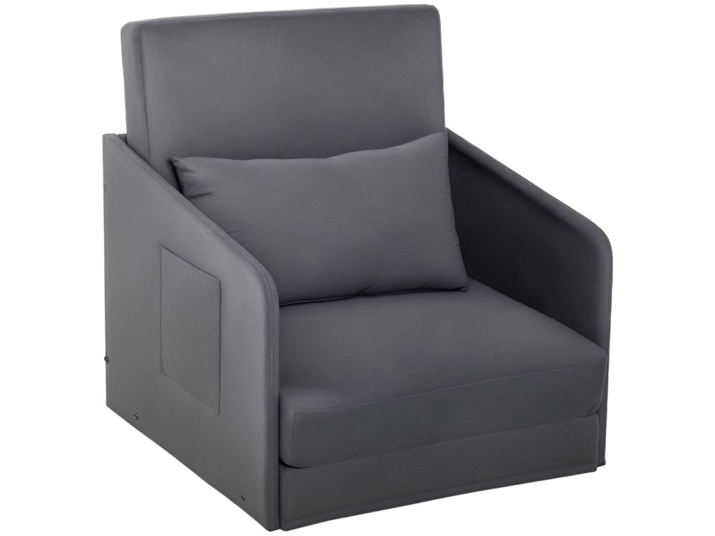 HOMCOM Rozkládací pohovka Jednolůžková rozkládací pohovka Omyvatelný potah 2 boční kapsy Polštáře kovové šedé 70 x 76 x 77 cm