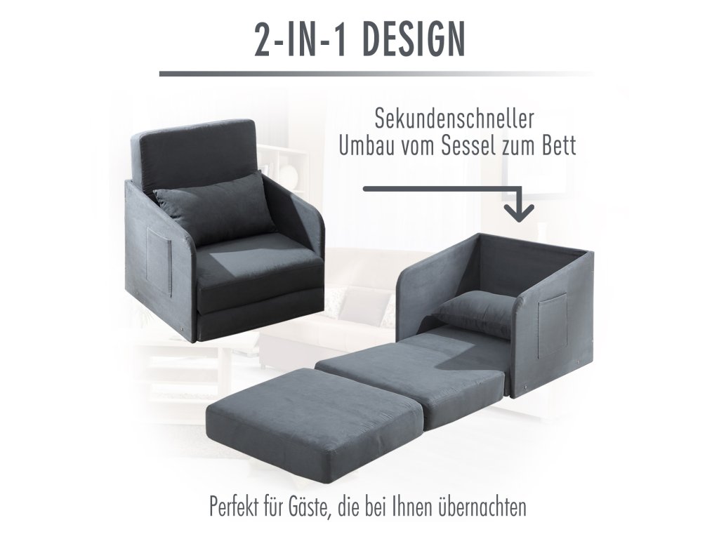 Útulné jako křeslo, mimořádně pohodlné jako postel: křeslo na spaní HOMCOM je pěkný a prostorově úsporný detail do obývacího pokoje, pracovny nebo dětského pokoje. Jeho přeměna ze sedačky na postel je snadná a lze ji provést v několika jednoduchých krocích. Na vnější straně područek jsou dvě kapsy, například na materiály ke čtení. Základem křesla lůžka je robustní kovový rám. Čalounění je vyrobeno ze silné výstavní látky a snímatelný a pratelný potah je z imitace semiše. Polštář na zádech lze použít také jako polštář. Rozkládací pohovka je všestranný pomocník, který potěší i vaši noční návštěvu.