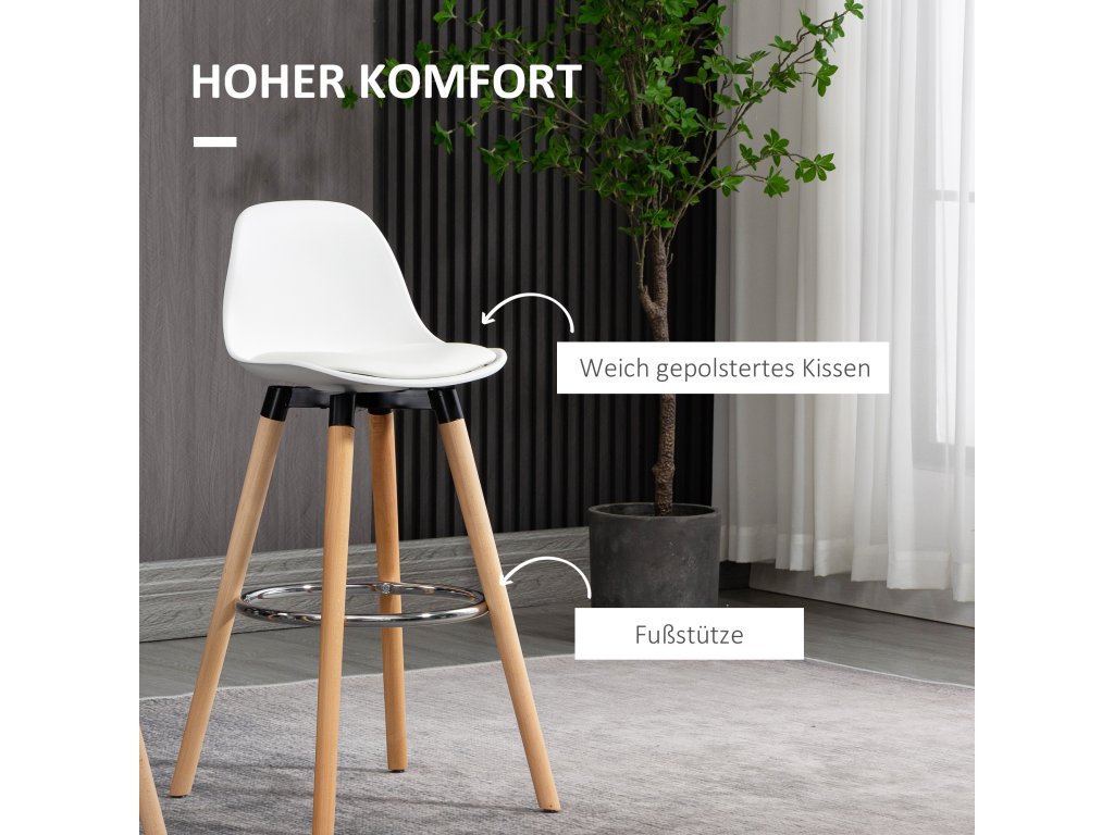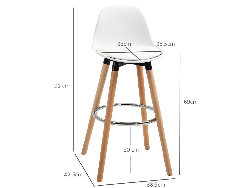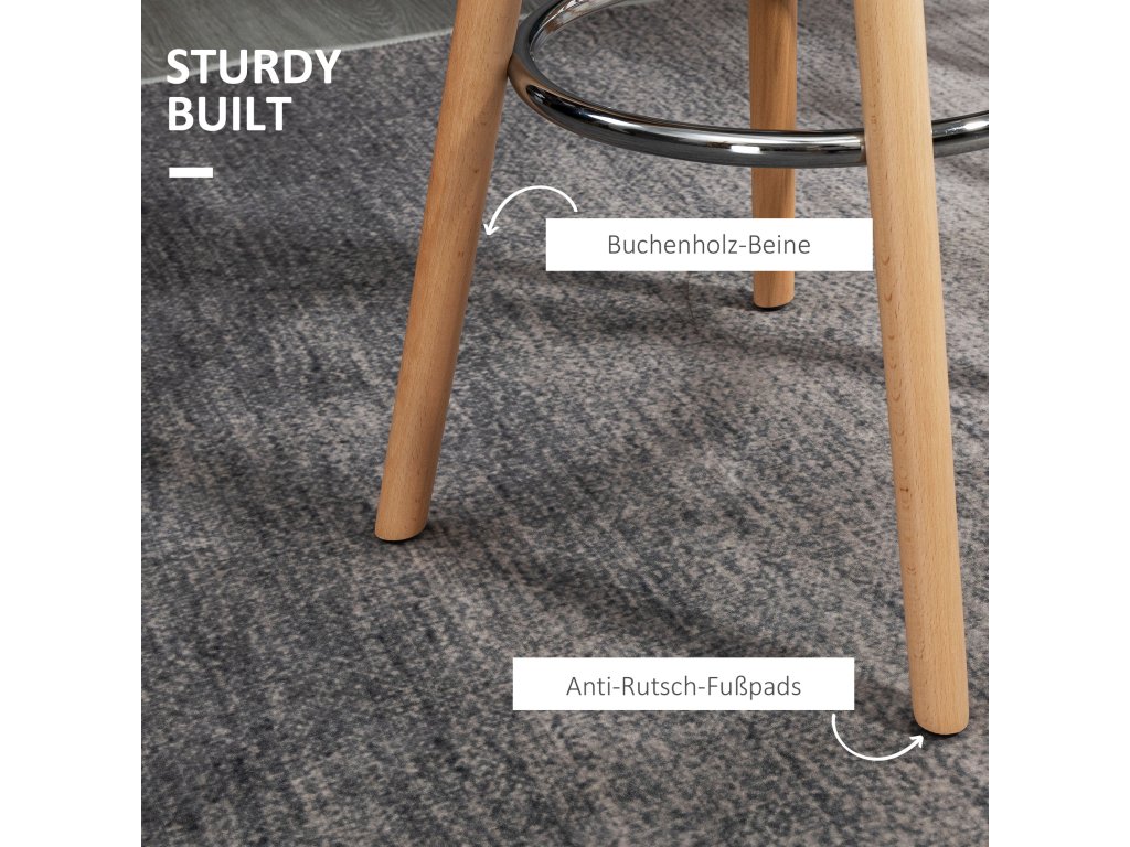 Skandinávský design a vysoká funkčnost charakterizují tuto sadu 2 barových židlí HOMCOM do kuchyně nebo jídelny. Barové stoličky jsou velmi stabilní, protože mají rám z masivního dřeva s protiskluzovou spodní stranou, která zajišťuje větší stabilitu a bezpečnost a zabraňuje jejich převrácení. Ocelové opěrky nohou zajišťují, že si nohy mohou odpočinout.