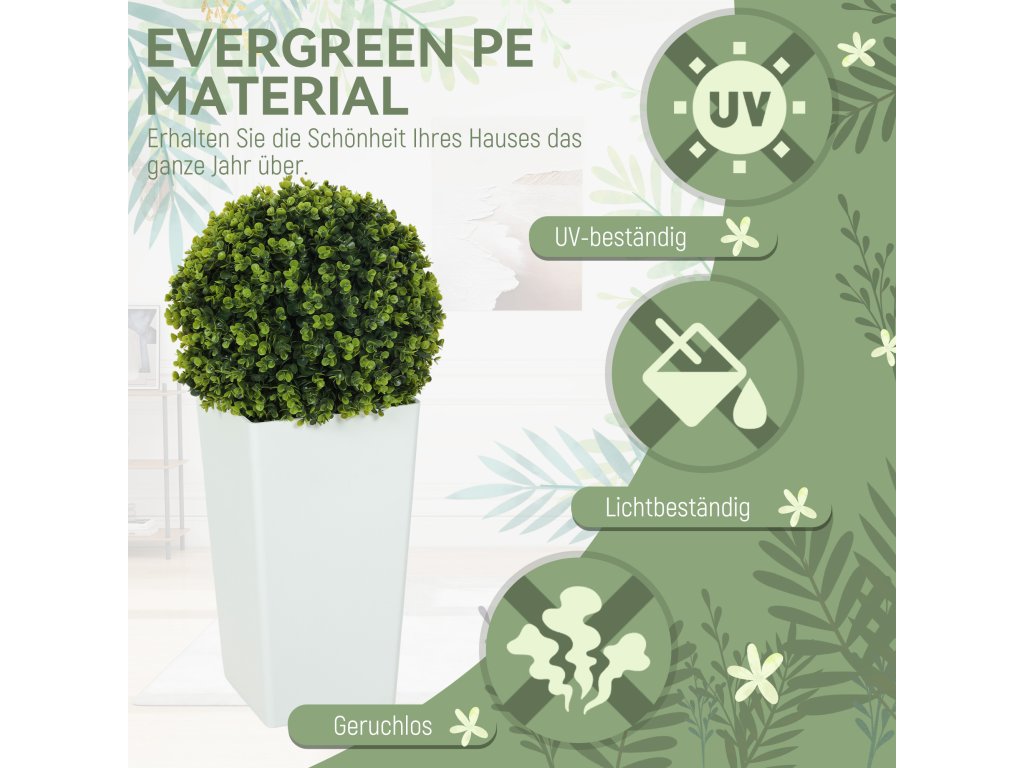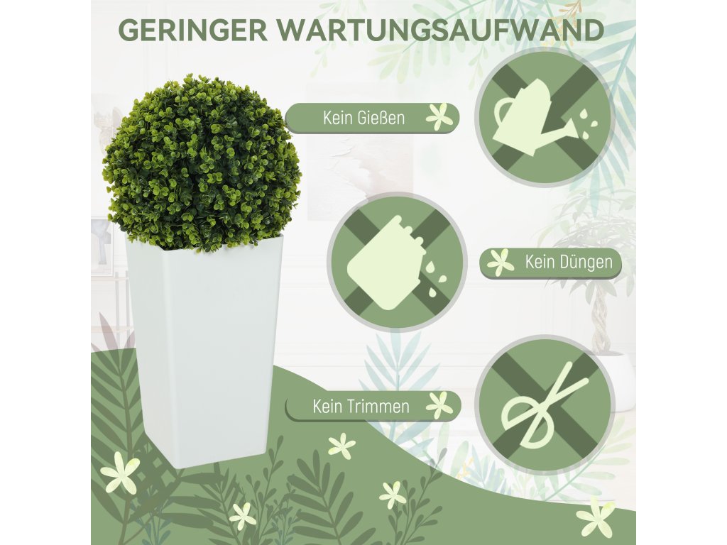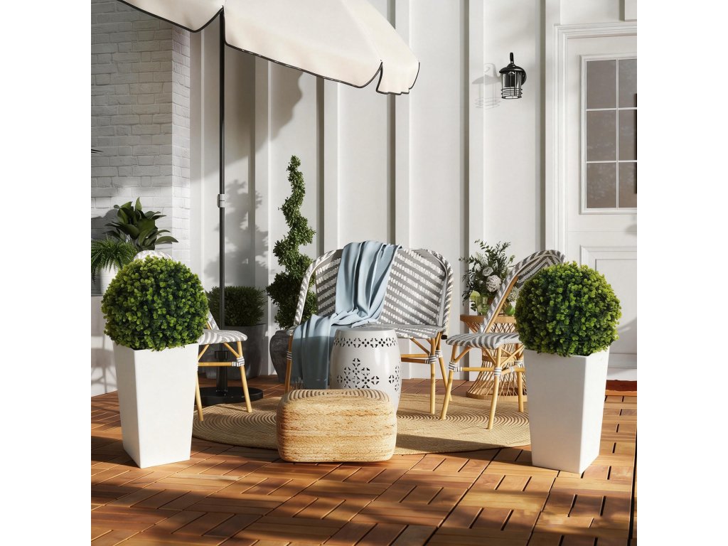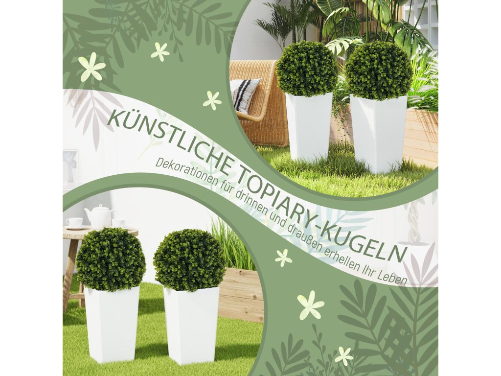 Umělé rostliny zkrášlí váš vstupní prostor symetrickou elegancí, ale péče o ně, zejména na slunných místech, je často zdlouhavá. S touto sadou dvou umělých rostlin HOMCOM zůstane zeleň díky UV ochraně trvale živá, bez zalévání a stříhání. Ideální do interiéru i exteriéru - zkrášlete si snadno svůj obytný prostor.