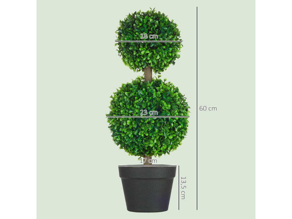 - Informace o umělých rostlinách: Celková výška: 60H cm. Velikost kulovitého keře: Ø18, Ø23 cm. Velikost květináče: Ø17 x 13,5H cm. Montáž není nutná