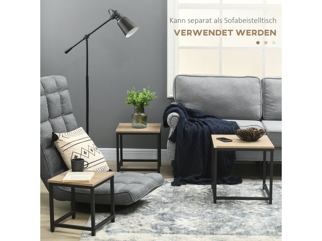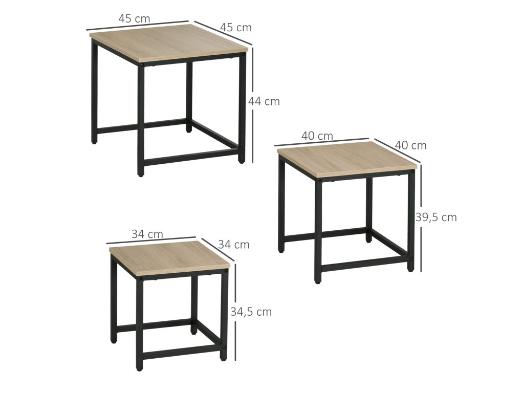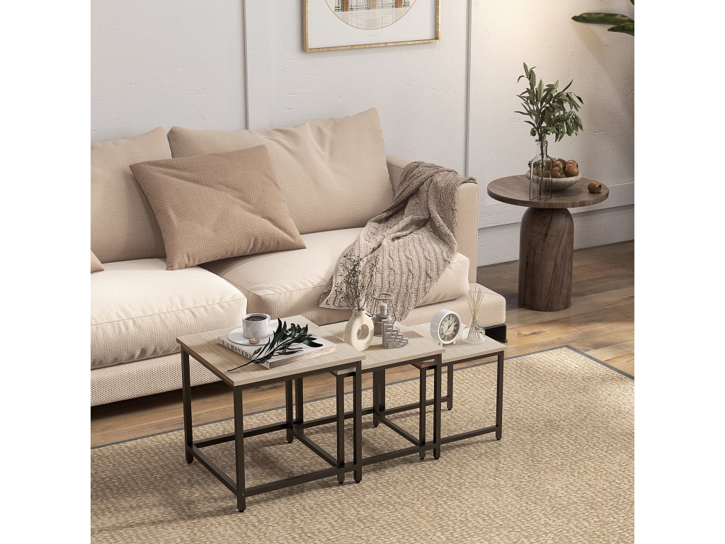 - Propracovaný design sady: Tři stolky sady lze používat samostatně nebo z nich můžete vytvořit dva nebo jen jeden konferenční stolek zasunutím menších stolků pod ty větší.