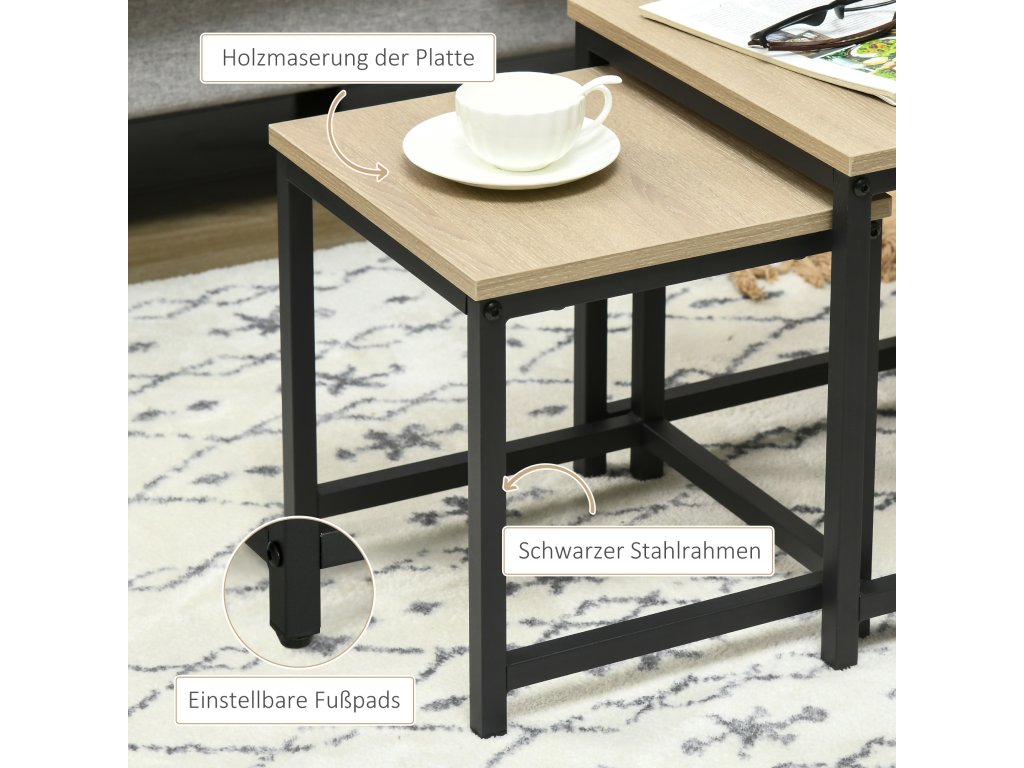 Objevte fascinující sadu odkládacích stolků od společnosti HOMCOM v oblíbeném industriálním designu. Využijte všestrannost stolků ze sady jako tři samostatné postranní stolky nebo je zkombinujte do jednoho či dvou stylových konferenčních stolků. Krásný vzhled dřeva a robustní ocelový rám dodají vašemu pokoji moderní šarm. Nastavitelné nožičky zajišťují stabilitu na nerovných podlahách. Proměňte svůj obývací pokoj ve stylovou zónu pohodlí s touto jedinečnou sadou postranních stolků!