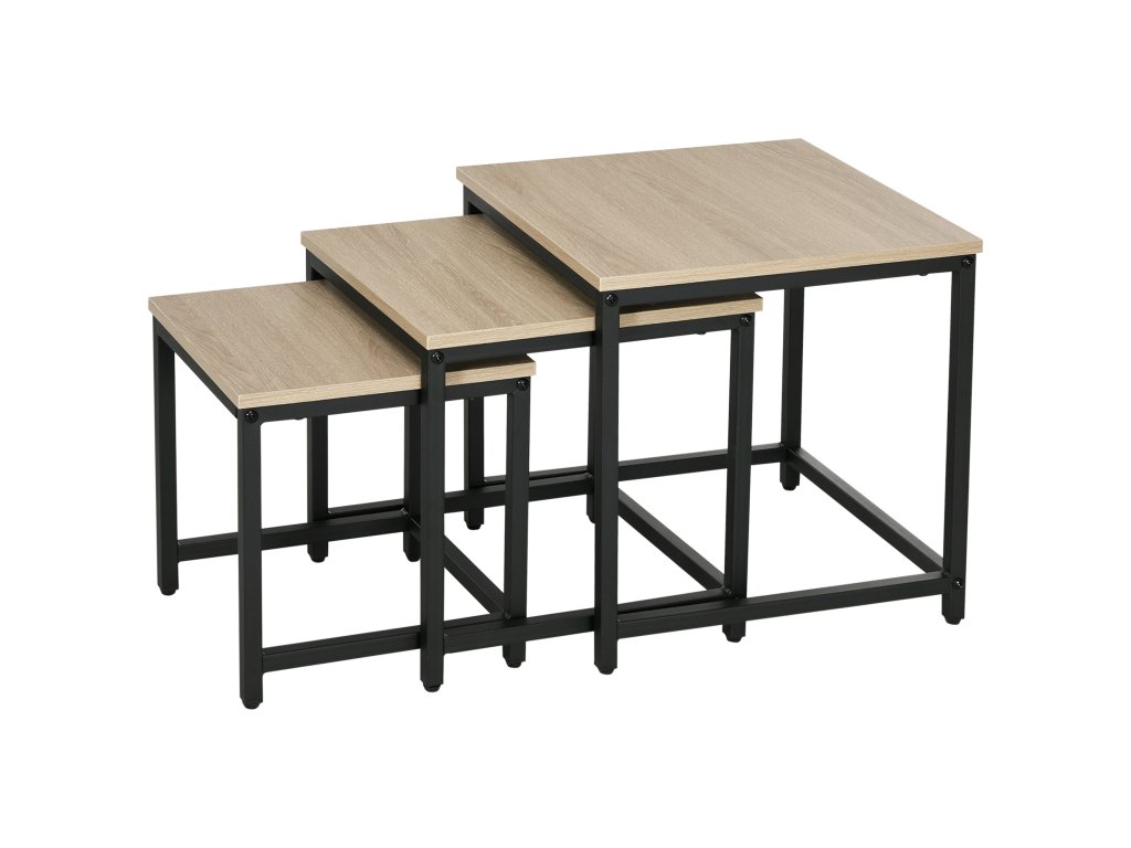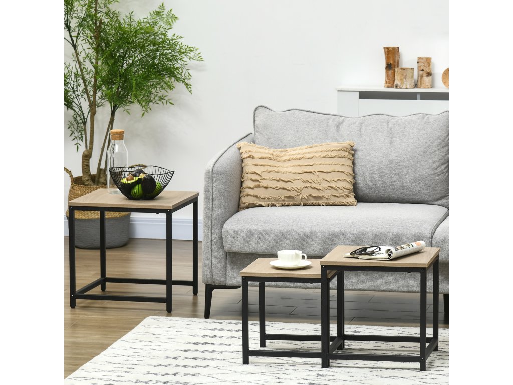 HOMCOM Sada 3 odkládacích stolků, industriální design, černý ocelový rám, deska ve vzhledu dřeva