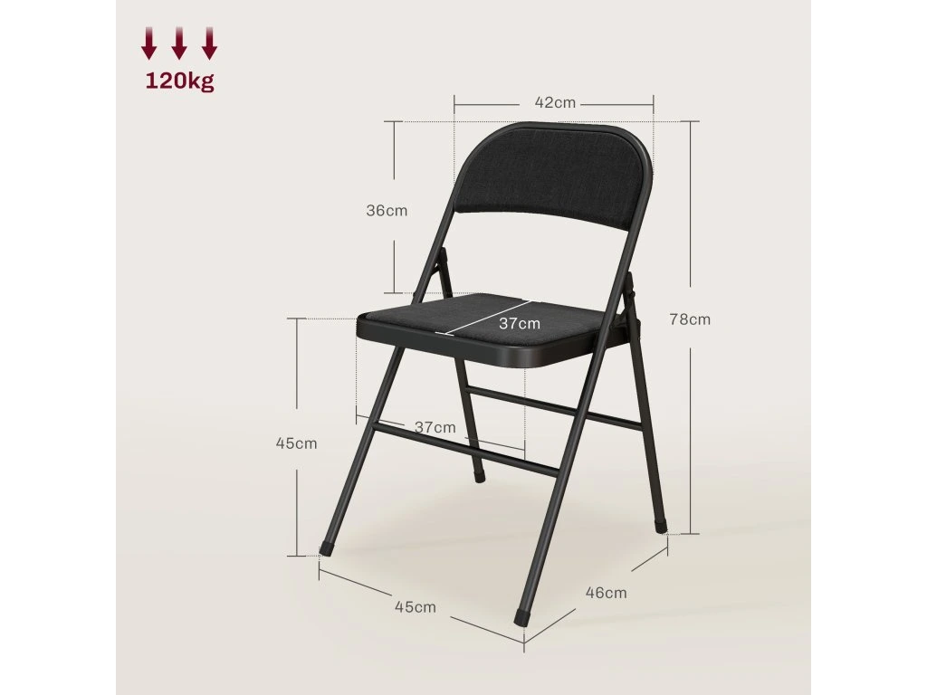 - Robustní konstrukce: Tyto skládací židle jsou vyrobeny z robustního kovu, nabízejí stabilní oporu a snesou zatížení až 120 kg, což zajišťuje jejich dlouhodobé používání. Navzdory své stabilitě jsou židle lehké