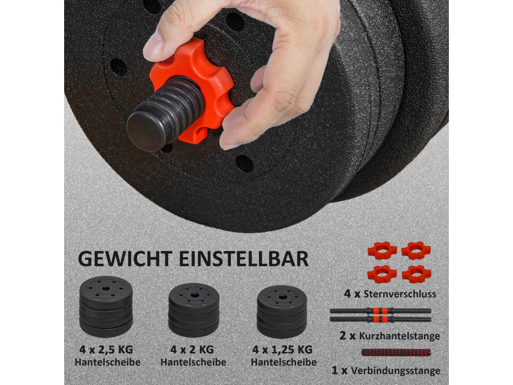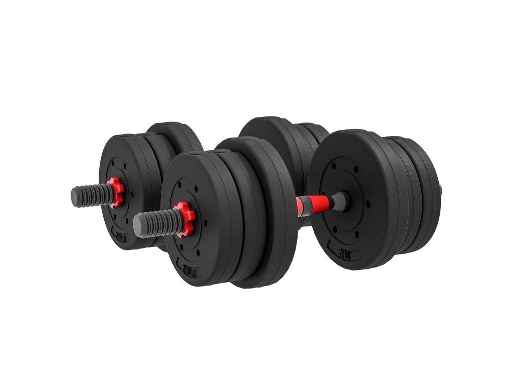 - ✔ Nastavitelné činky se skládají z: 4 x 2 kg, 4 x 1,5 kg, 4 x 1,25 kg zátěžových kotoučů, dvou tyčí, spojovací tyče a 4 pojistných matic