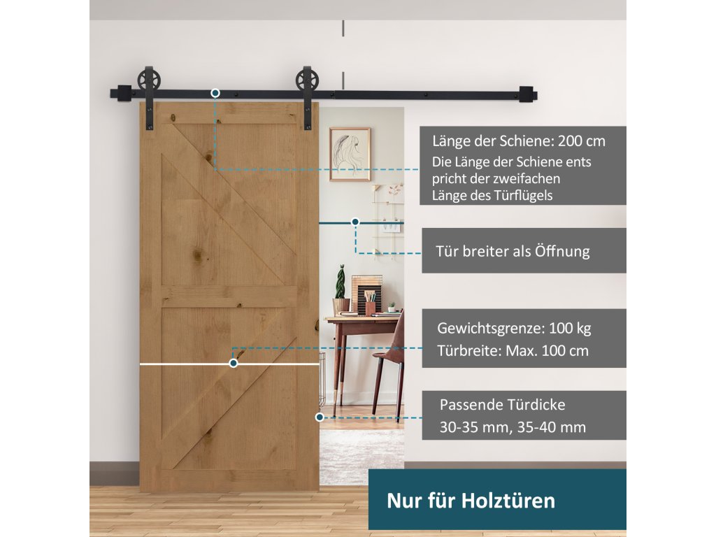 - Vyrobeno tak, aby vydrželo: Vyrobeno z vysoce kvalitní uhlíkové oceli, nosnost až 90 kg, vhodné pro dřevěné dveřní výplně s kováním pro posuvné dveře o tloušťce 3,4-4 cm a šířce menší než 100 cm. Minimální vzdálenost od horní části dveří ke stropu: 18 cm. Vhodné pouze pro dřevěné dveře.
