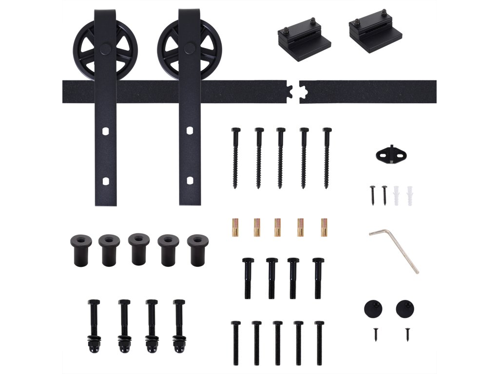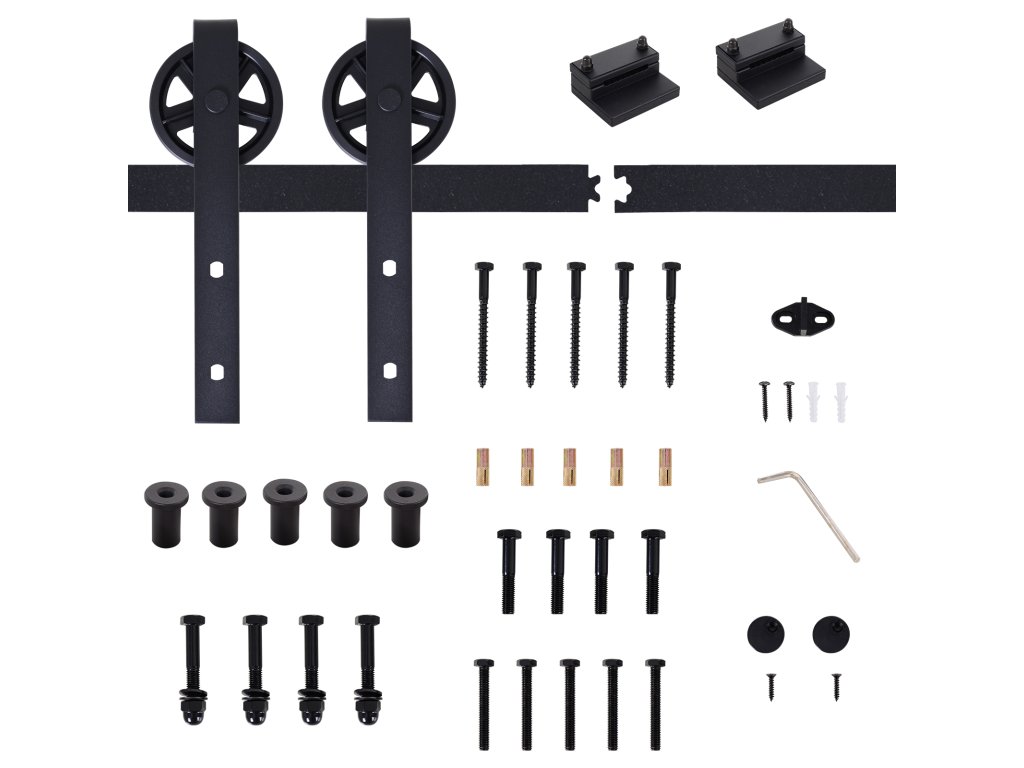 - Systém posuvných dveří obsahuje: 2 x kolejnice, 2 x váleček, 2 x zarážky kolejnic, 1 x podlahový blok, 1 x sada šroubů do dveří, 1 x sada samořezných šroubů (pro dřevěné a betonové stěny)