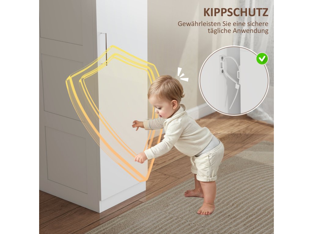 - Bezpečnost, které můžete důvěřovat: Šatní skříň se dodává se sadou proti překlopení, která zaručuje bezpečnou montáž a poskytuje dodatečnou bezpečnost - ideální pro domácnosti, kde je třeba zaručit dlouhodobou stabilitu a bezpečnost.