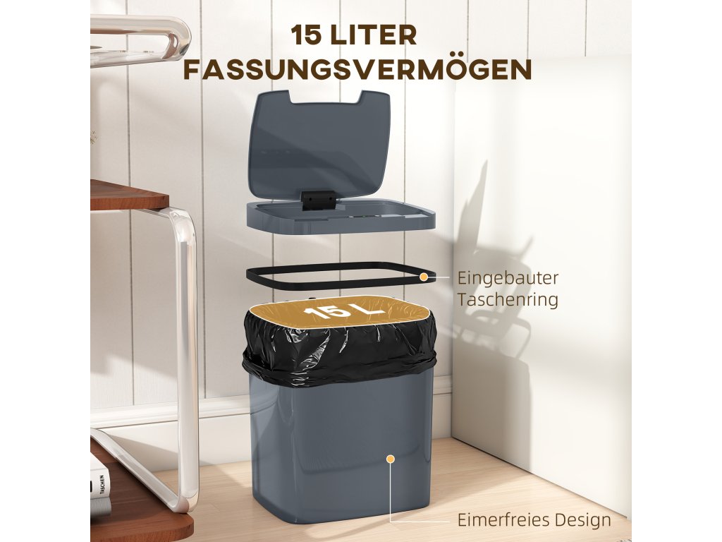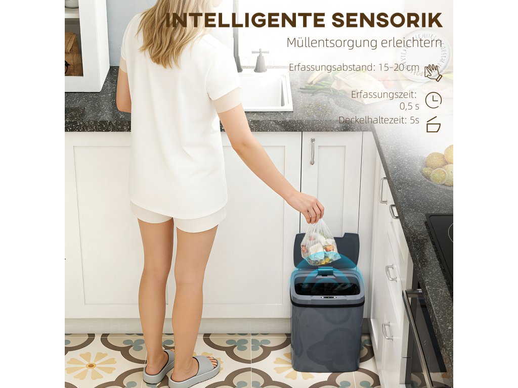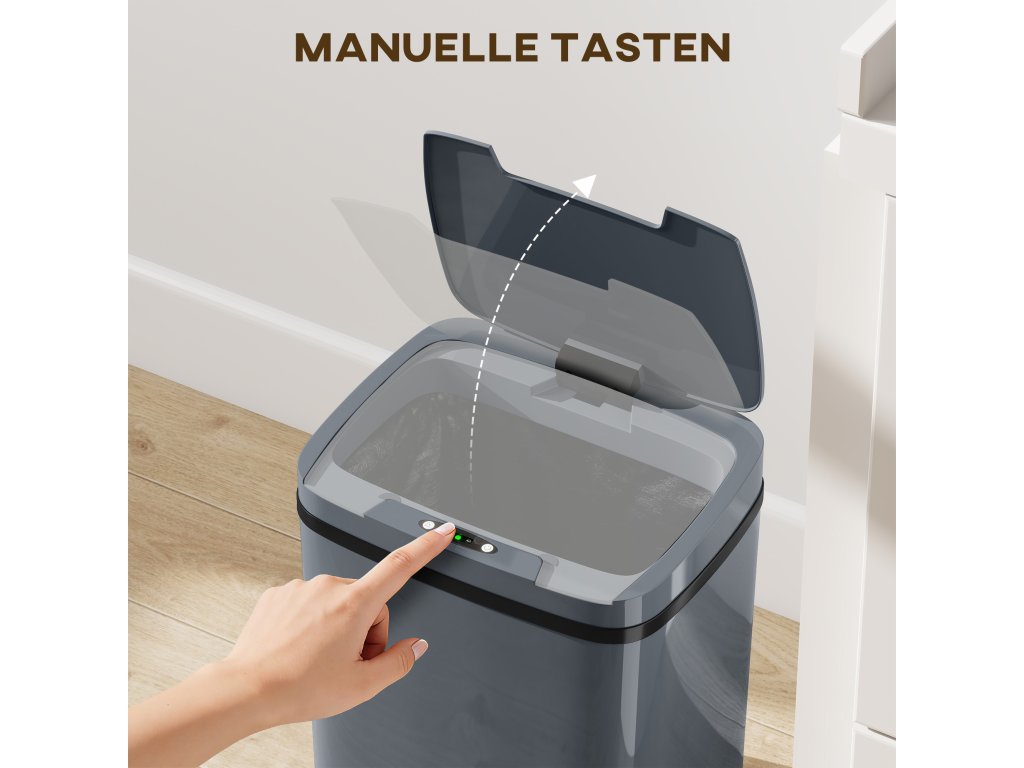 Dejte sbohem chaosu s odpadkovým košem HOMCOM se senzorem! Otevírá se bezdotykově pouhým pohybem zápěstí, takže vaše ruce zůstanou čisté. Dáváte přednost ručnímu ovládání? Stačí přepnout a výměna sáčků je hračka. Tento elektrický odpadkový koš o objemu 15 l je ideální pro stísněné kuchyně a nabízí stylové a praktické řešení pro udržení pořádku v kuchyni.