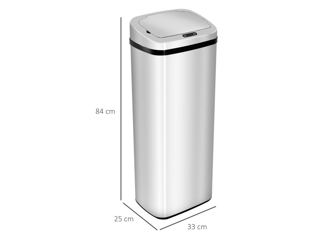 Automatický odpadkový koš o objemu 50 litrů z nerezové oceli od společnosti HOMCOM přispívá k pohodlné a hygienické likvidaci vašeho odpadu. Odpadkový koš se senzorem se automaticky otevře, když se k němu přiblížíte na vzdálenost 20-35 cm. Jakmile odpad zmizí v bateriovém odpadkovém koši se senzorem, koš se automaticky zavře. Tuto funkci lze v případě potřeby vypnout a víko pak můžete otevřít nebo zavřít stisknutím tlačítka. Automatický odpadkový koš se senzorem je díky své velké kapacitě vhodný zejména do kuchyně, ale lze jej použít i v jakékoli jiné místnosti.