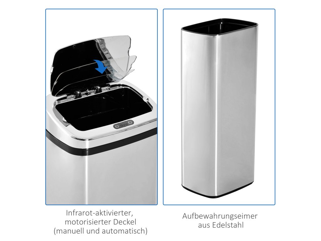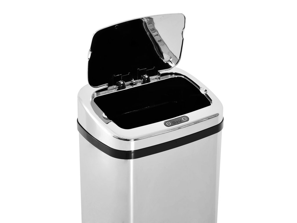 - Bezdotykové ovládání: Integrovaný pohybový senzor automaticky otevře a zavře víko, jakmile se k němu přiblíží vaše ruka - pro hygienické a snadné vyhazování odpadu.
