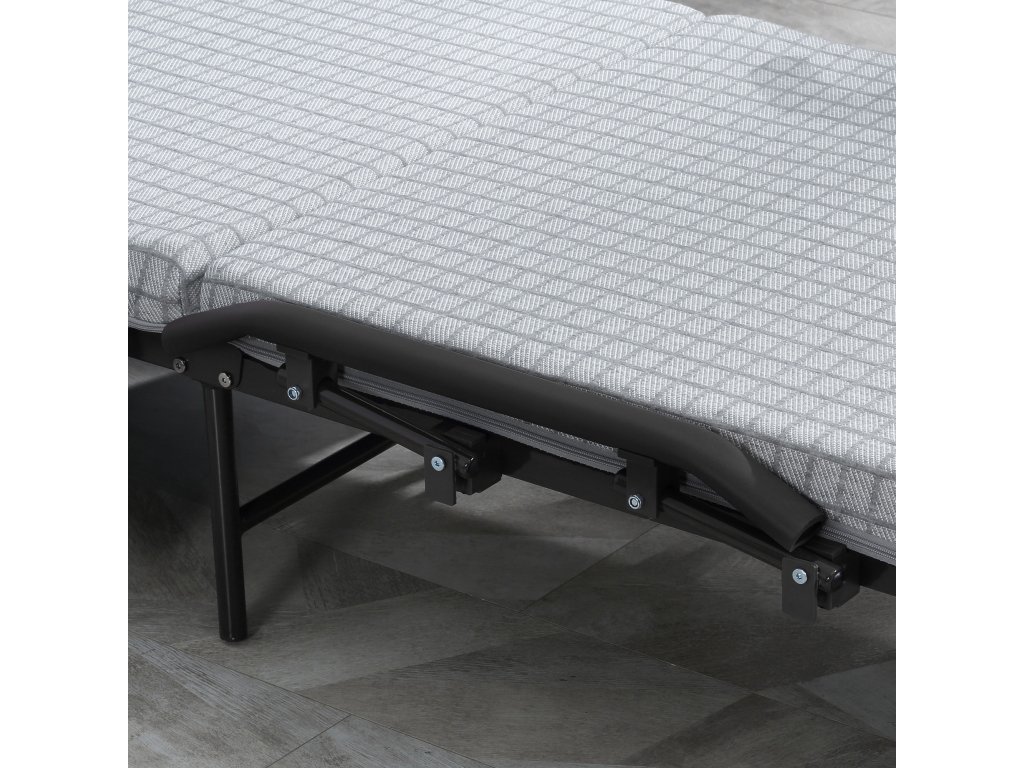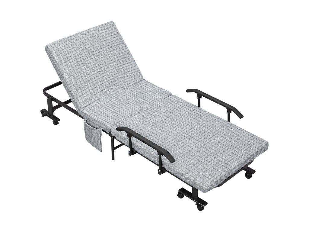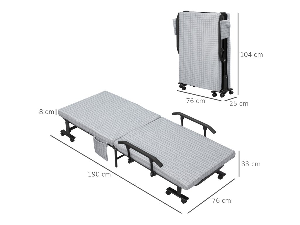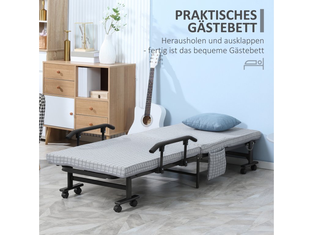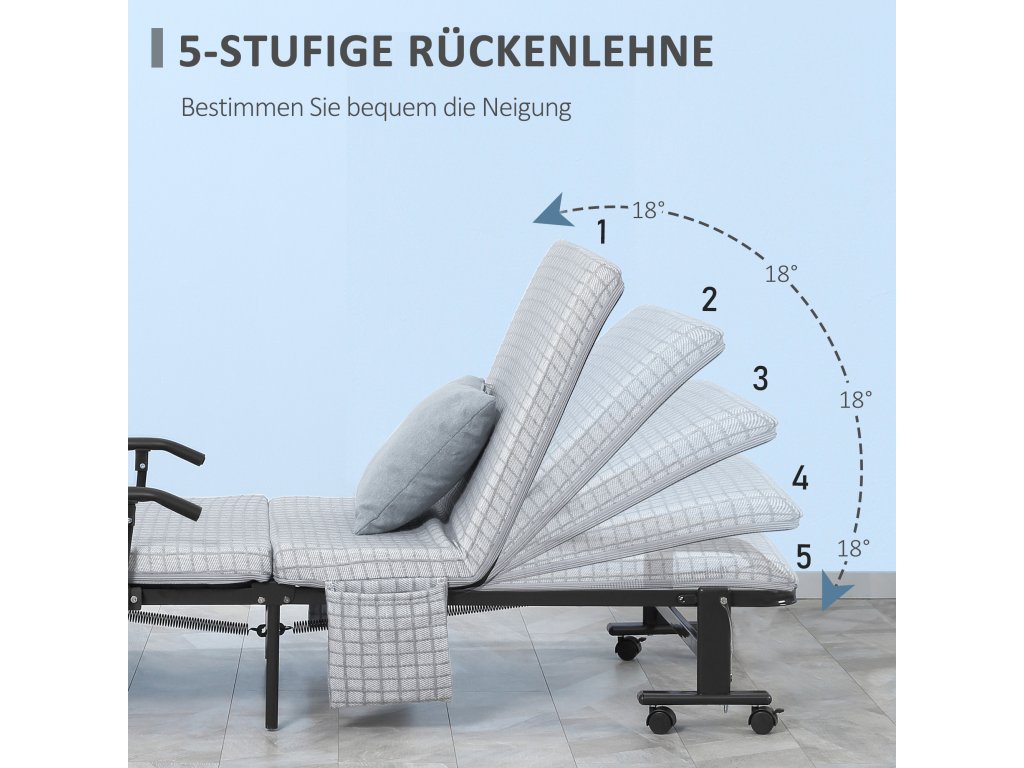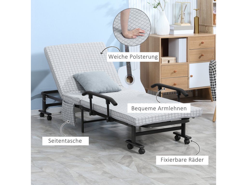 HOMCOM Skládací postel, postel pro hosty, sklopné opěradlo, područky, 8 koleček, ocelový rám, světle šedá+černá, 190 x 76 x 33cm