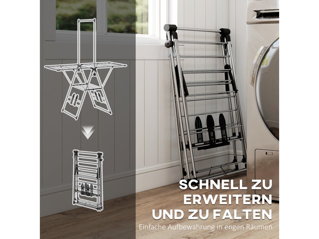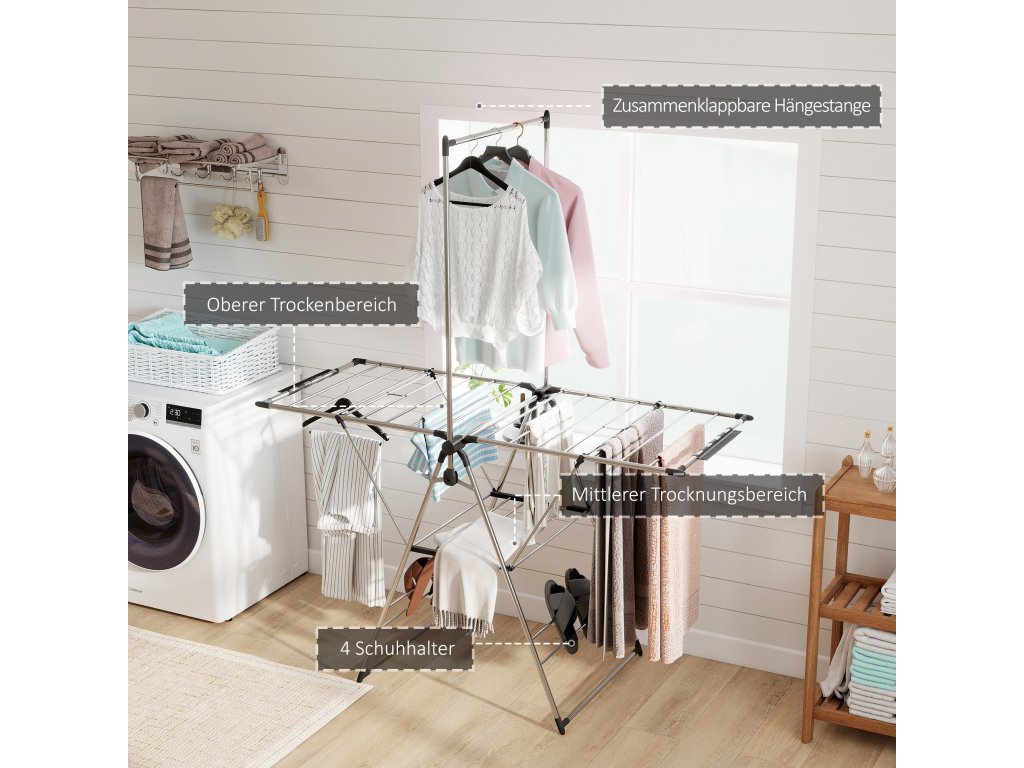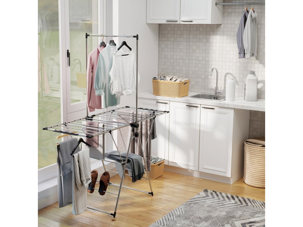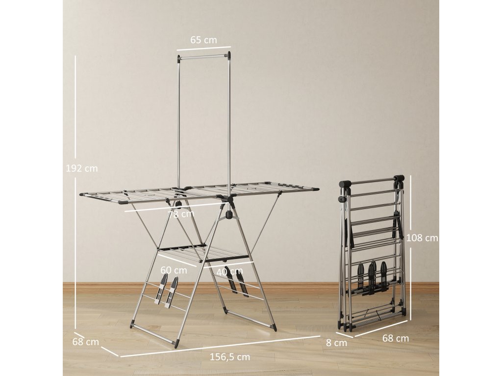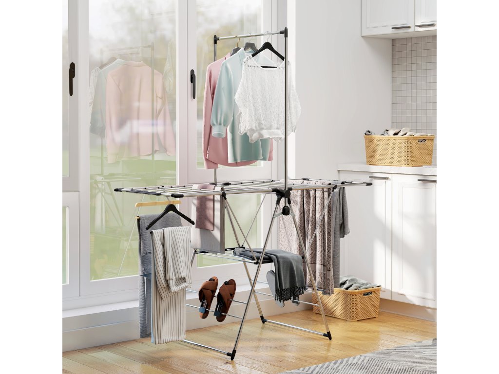 HOMCOM Skládací sušák na prádlo s nastavitelnými křídly, držáky na boty, nerezová ocel, 156,5 x 68 x 192 cm, stříbrný