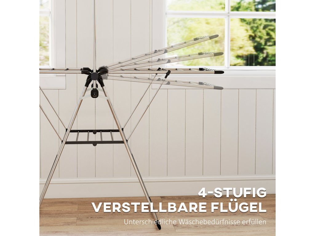 - Nastavitelná konstrukce křídel: Sušák na prádlo si můžete flexibilně přizpůsobit svým potřebám díky čtyřem nastavitelným výškovým úrovním, které jsou ideální pro zavěšení dlouhých kusů oblečení, aniž by se dotýkaly podlahy. Díky tomu je křídlový sušák univerzální pro všechny typy prádla.