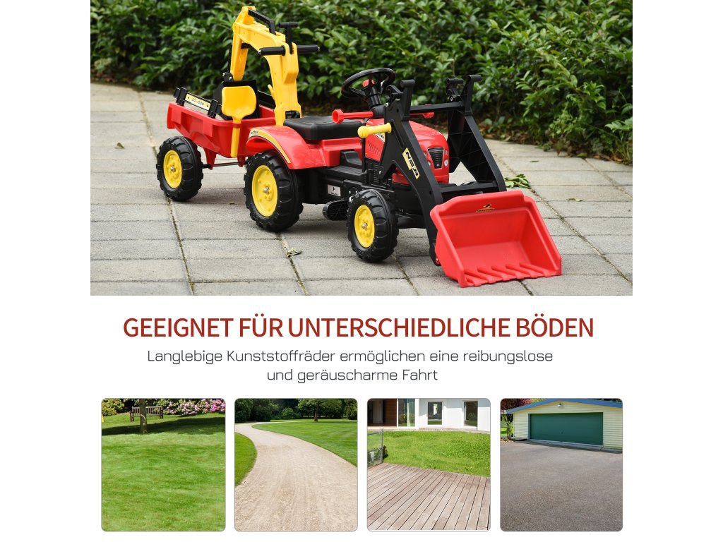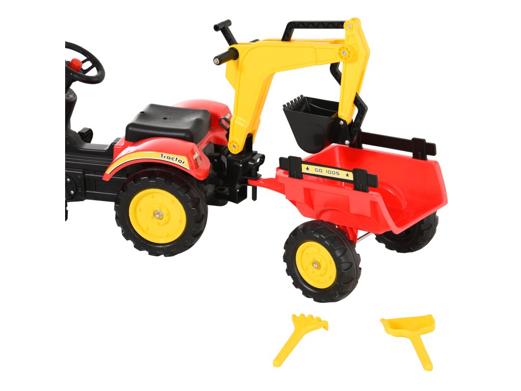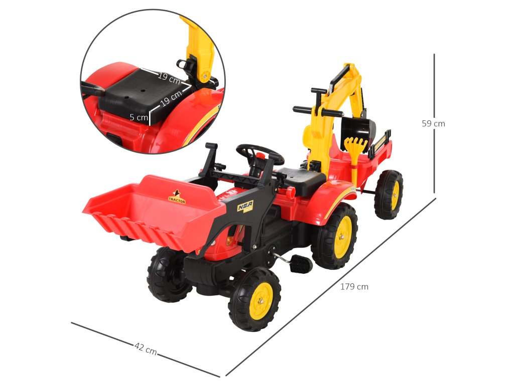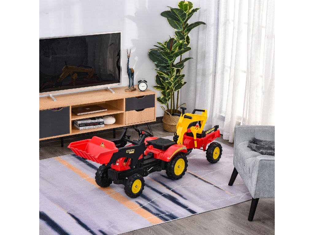 HOMCOM Šlapací traktor s přívěsem, čelním nakladačem, nastavitelnou lopatou, šlapací traktor pro děti od 3 let Červený