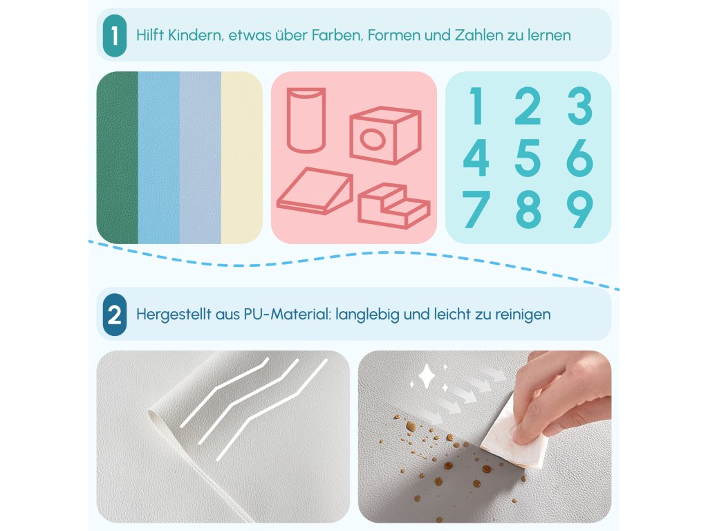 Tyto měkké stavební kostky od společnosti HOMCOM jsou ideálním dárkem pro dítě, které právě začíná lézt na věci. Tyto bloky mohou batolata naučit lézt, plazit se a klouzat, čímž podporují rozvoj hrubé motoriky. Stavební bloky jsou potaženy měkkou imitací kůže a snadno se čistí. Sada pěnových stavebních bloků nabízí bezpečnou hru pro děti doma, ve školce i ve škole. Dítě může 4 dílky libovolně přeskládat a kombinovat.