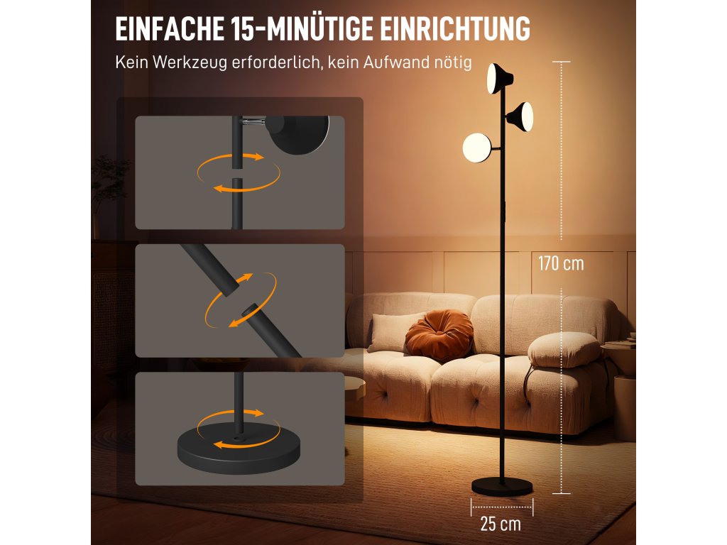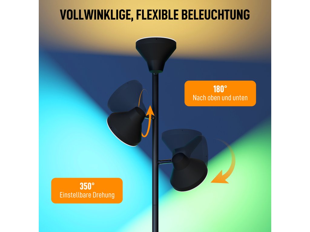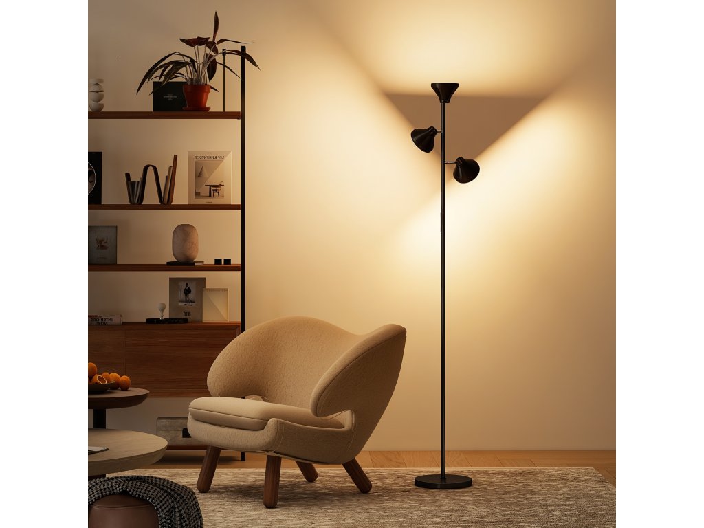 - Flexibilní trojí ovládání lampy: Díky třem nezávisle nastavitelným hlavicím nabízí tato stmívatelná stojací lampa všestranné možnosti osvětlení. Každou hlavu lze otáčet o 350° a naklápět o 180°, což umožňuje cílené nebo celoplošné osvětlení, které vyhovuje jakýmkoli požadavkům v místnosti.