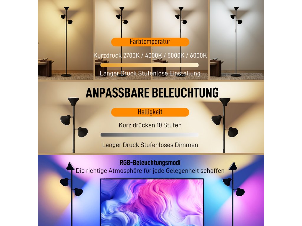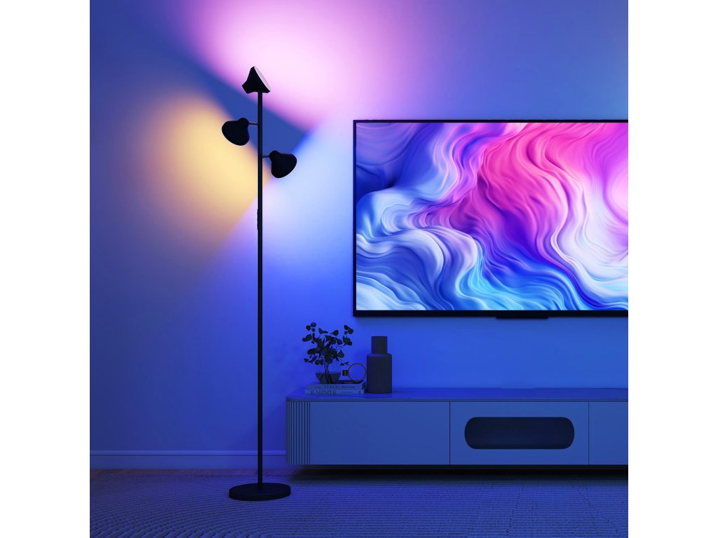Vadí vám špatné osvětlení? Pokud si chce jedna osoba číst, zatímco druhá odpočívá, jedna lampa nestačí. Stojací lampa HOMCOM nabízí tři nezávisle nastavitelné světelné hlavy, které lze otáčet v rozsahu 350° horizontálně a 180° vertikálně, se svítivostí 4150 lumenů, RGB a přizpůsobitelným bílým světlem, včetně dotykového a dálkového ovládání. Stmívatelná stojací lampa s režimem čtení a nočním režimem, devíti scénáři, hodinovým časovačem a snadným resetem poskytuje přizpůsobené světlo a dokonalou náladu.
