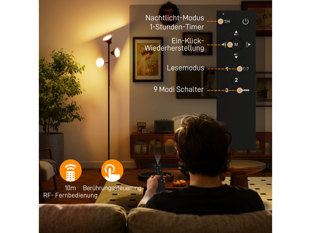 - Bezproblémové dvojí ovládání: pohodlně ovládejte jas a teplotu barev pomocí dotykových tlačítek nebo dálkového ovladače RF s dosahem 10 m. Stojací lampa je vybavena funkcí okamžitého obnovení, režimy čtení a nočního osvětlení, devíti nastaveními scén a časovačem na 1 hodinu a poskytuje flexibilní osvětlení pro jakoukoli část místnosti.