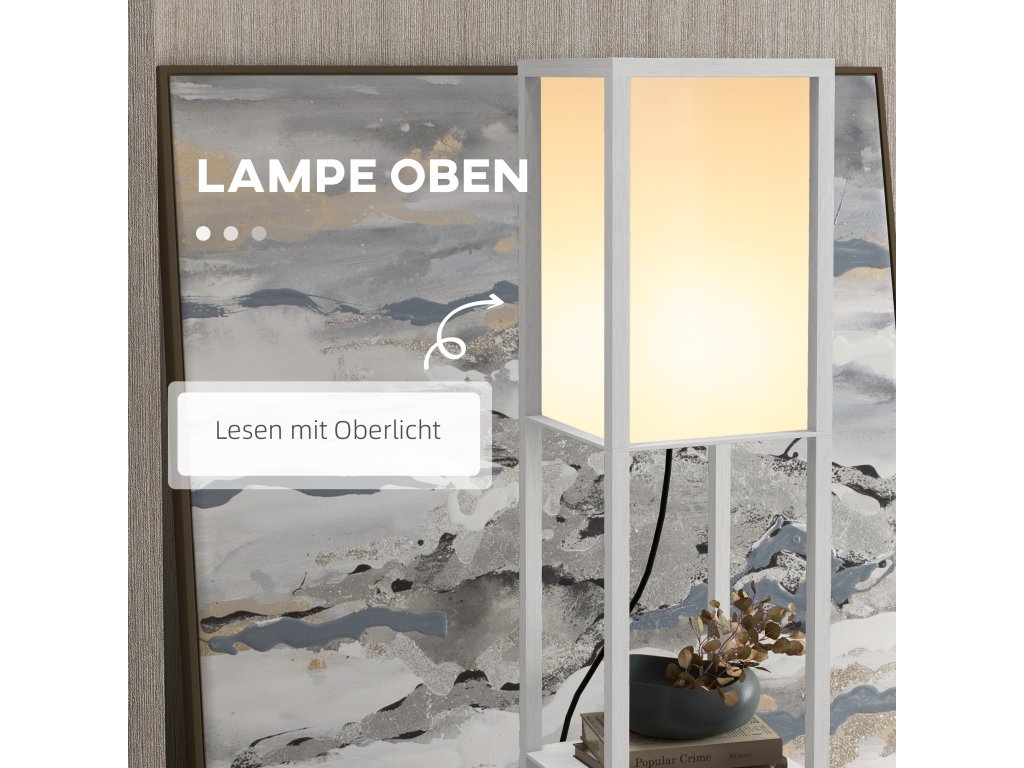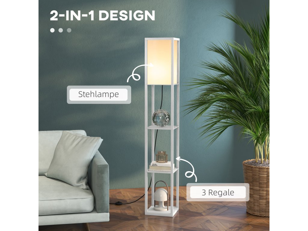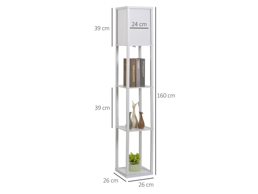 Elegantní a funkční stojací lampa HOMCOM kombinuje stylový úložný prostor s jemným osvětlením. Na třech otevřených policích stojací lampy můžete vystavit knihy, dekorativní předměty nebo rostliny a díky vestavěné stojací lampě vytvořit útulnou atmosféru.