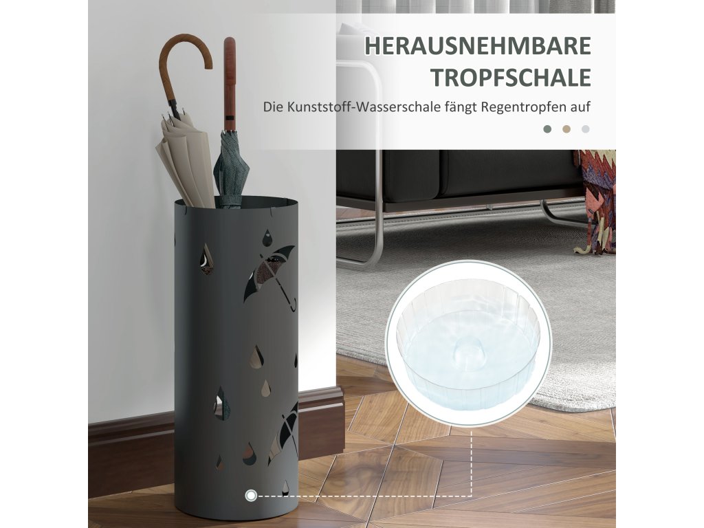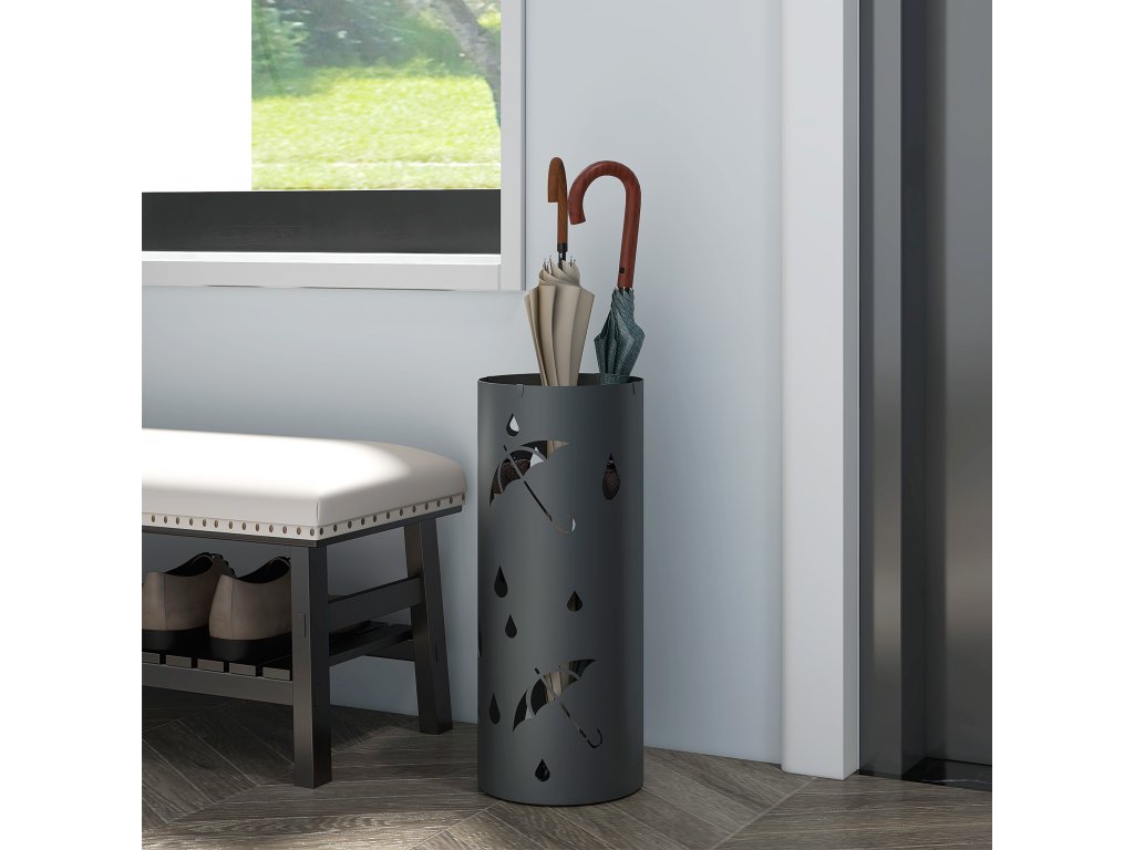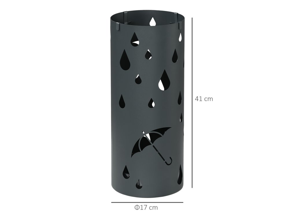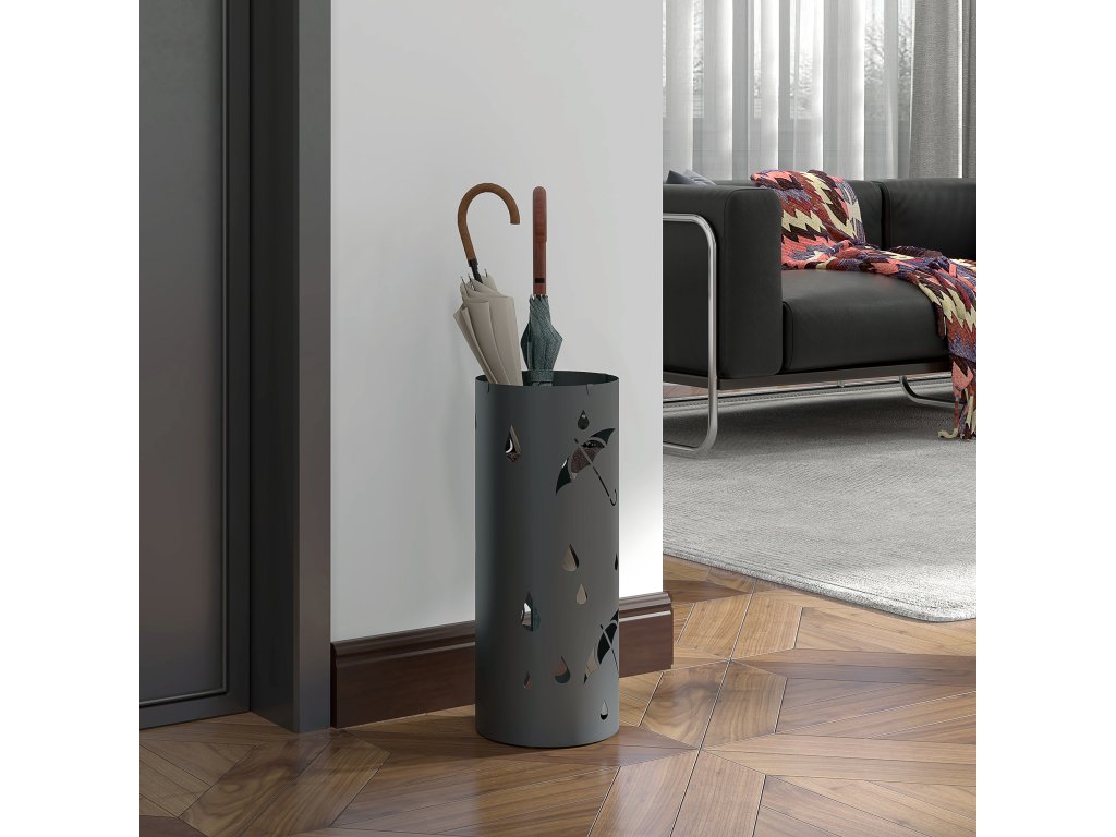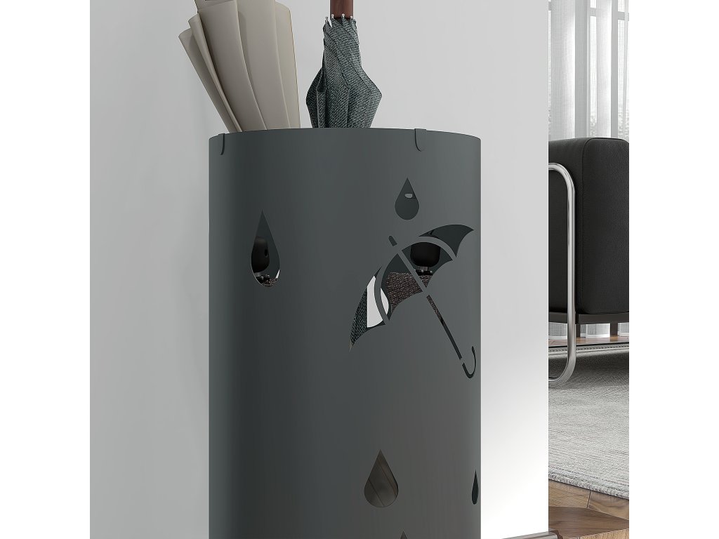 - Dekorativní design s výřezy: Díky okouzlujícímu vzoru dešťových kapek a deštníků vypadá tento stojan na deštníky jako šitý na míru.