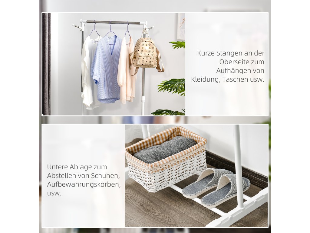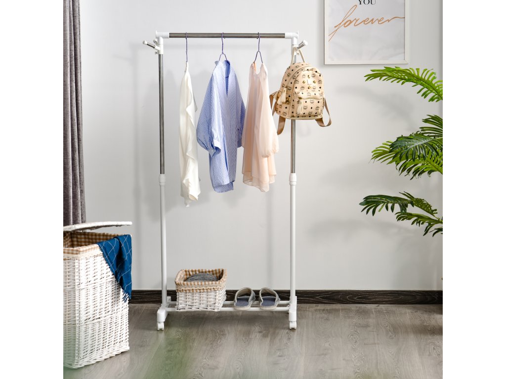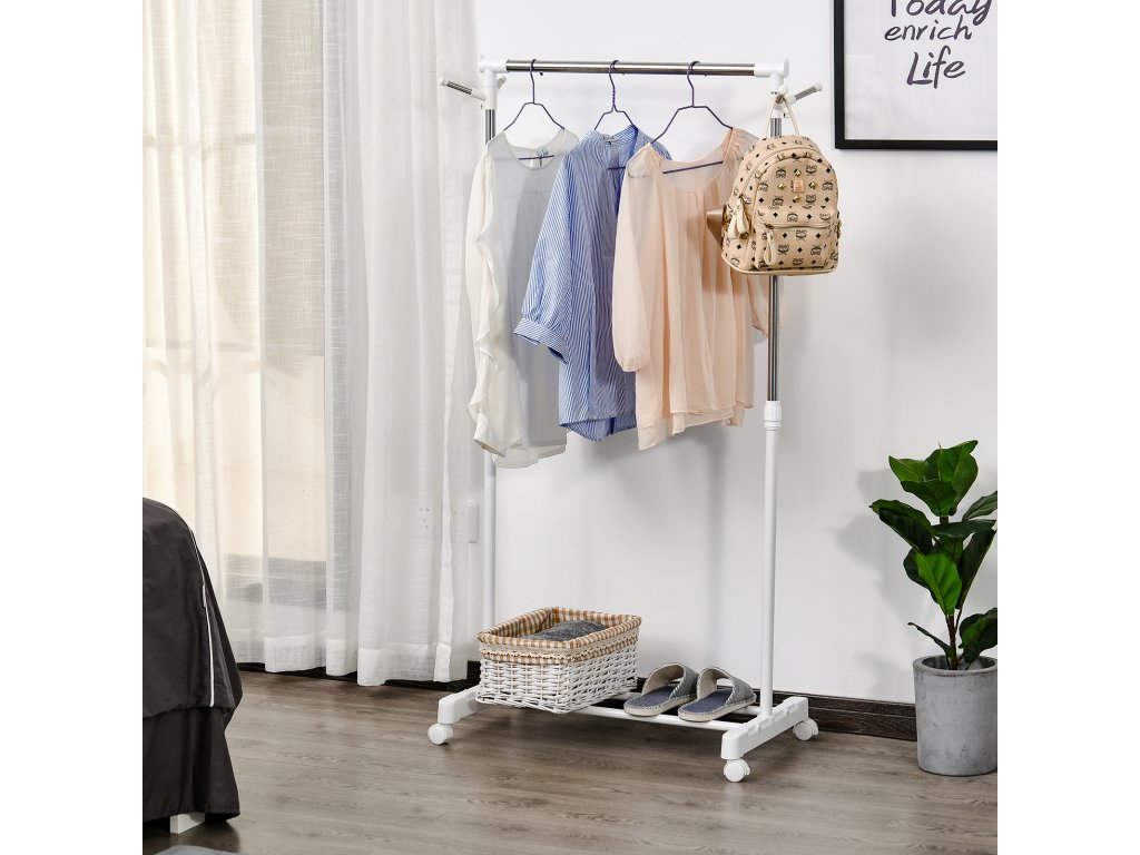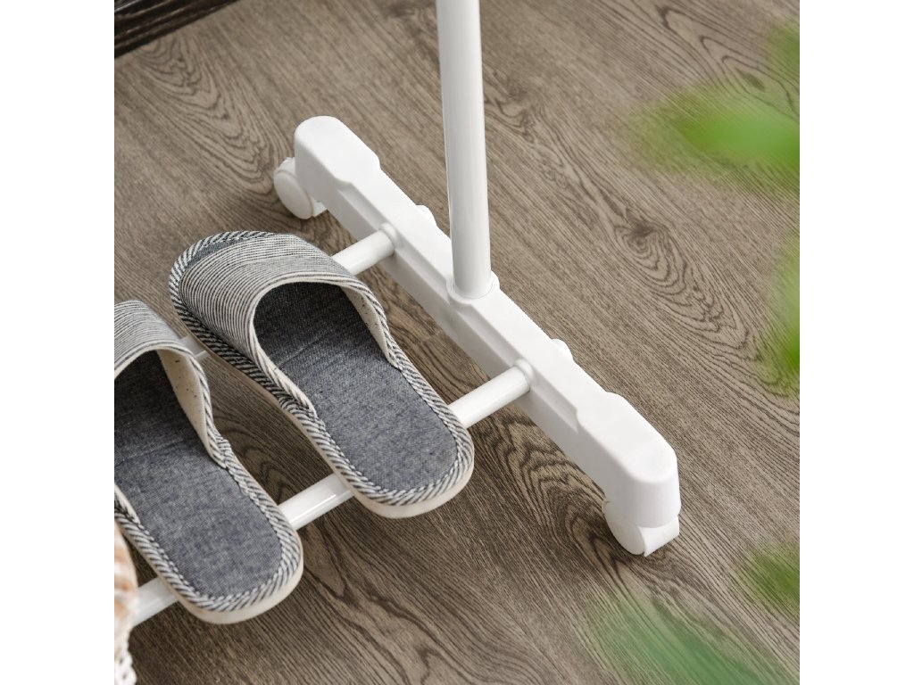 HOMCOM Stojan na kabáty na kolečkách, výškově nastavitelný, se spodní policí, 4 kolečka, bílý