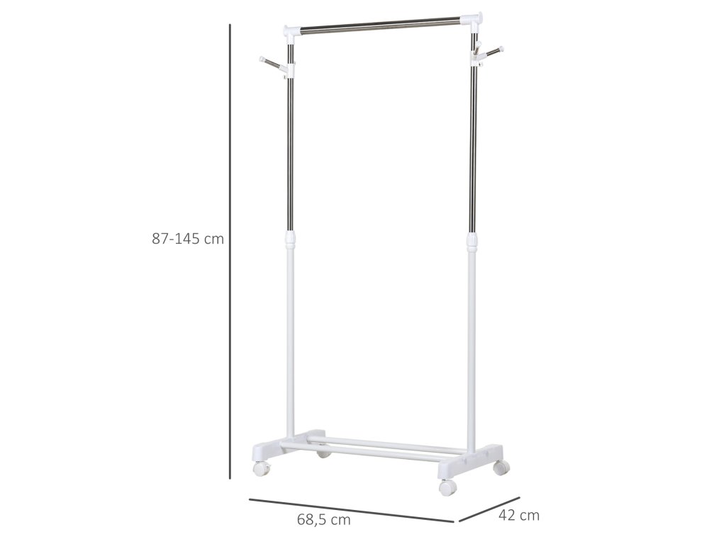 Pojízdný a nastavitelný stojan na kabáty HOMCOM se 4 kolečky, z nichž 2 mají brzdu. Nastavení výšky podle velikosti oděvu a místnosti. Vynikající pro optimální využití prostoru v malých obchodech i v domácnostech. S přídavnými háčky a policí ve spodní části pro další úložný prostor.