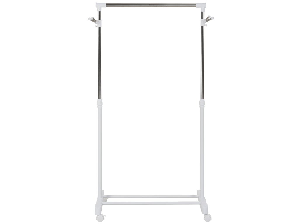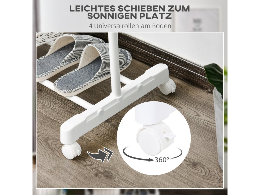 - ✔ 4 bílá PP kolečka na věšáku výrazně usnadňují jeho přesun z jedné místnosti do druhé. Dvě z těchto koleček jsou vybavena brzdami, které ho zablokují, když s ním nechcete hýbat