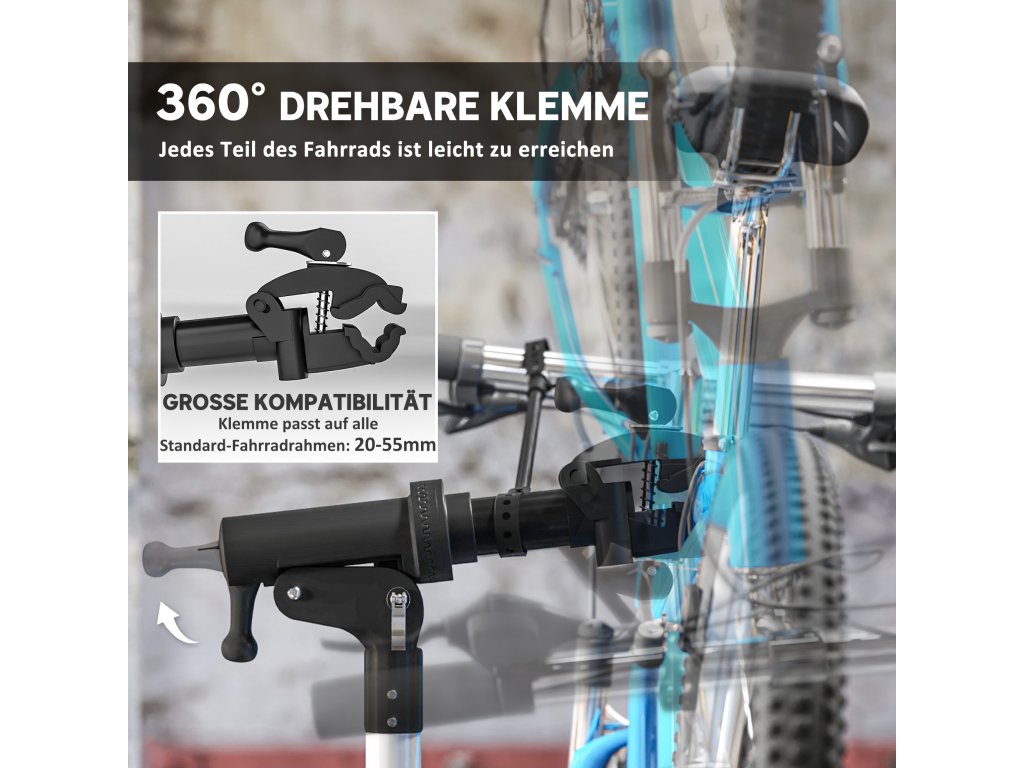 - Široká kompatibilita: Tento stojan na opravu jízdních kol je určen pro standardní rámy kol o průměru 20-55 mm a upevňuje jízdní kola a elektrokola o hmotnosti až 40 kg. Je vhodný pro širokou škálu modelů