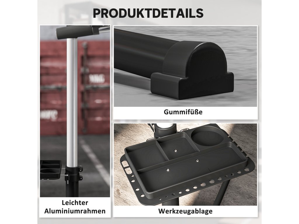 - Prostorově úsporné provedení: Stojan na opravu kol lze snadno složit, což umožňuje pohodlné skladování a úsporu místa v domácnosti nebo garáži. Integrovaná přihrádka na nářadí poskytuje dodatečnou organizaci