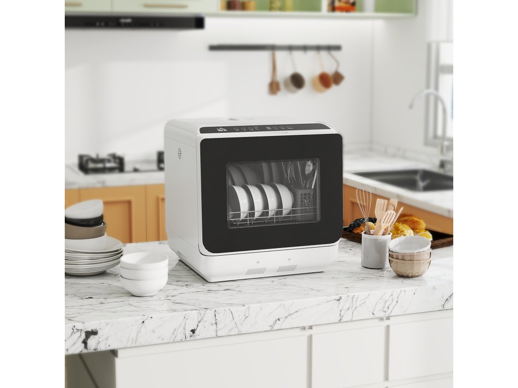 HOMCOM Stolní myčka nádobí, mini myčka s nádrží na 6 litrů, 5 programů, LED displej, funkce sušení, bílá barva