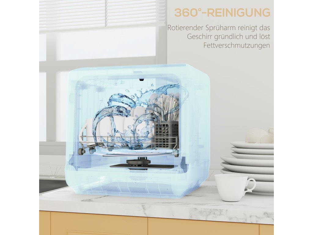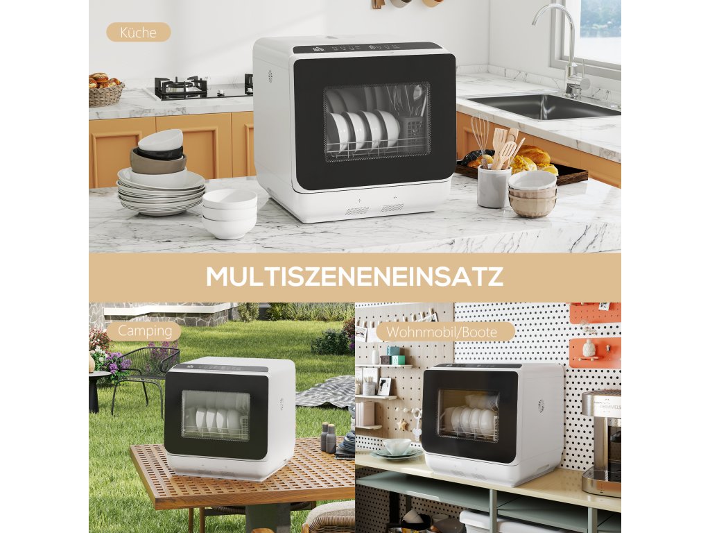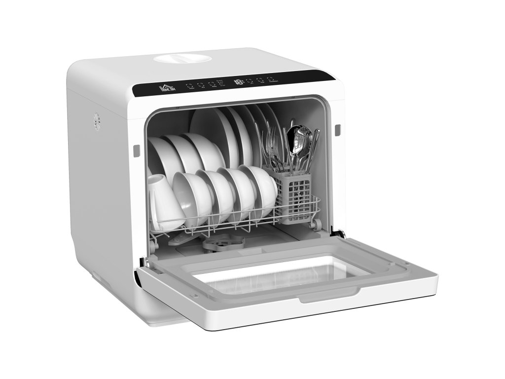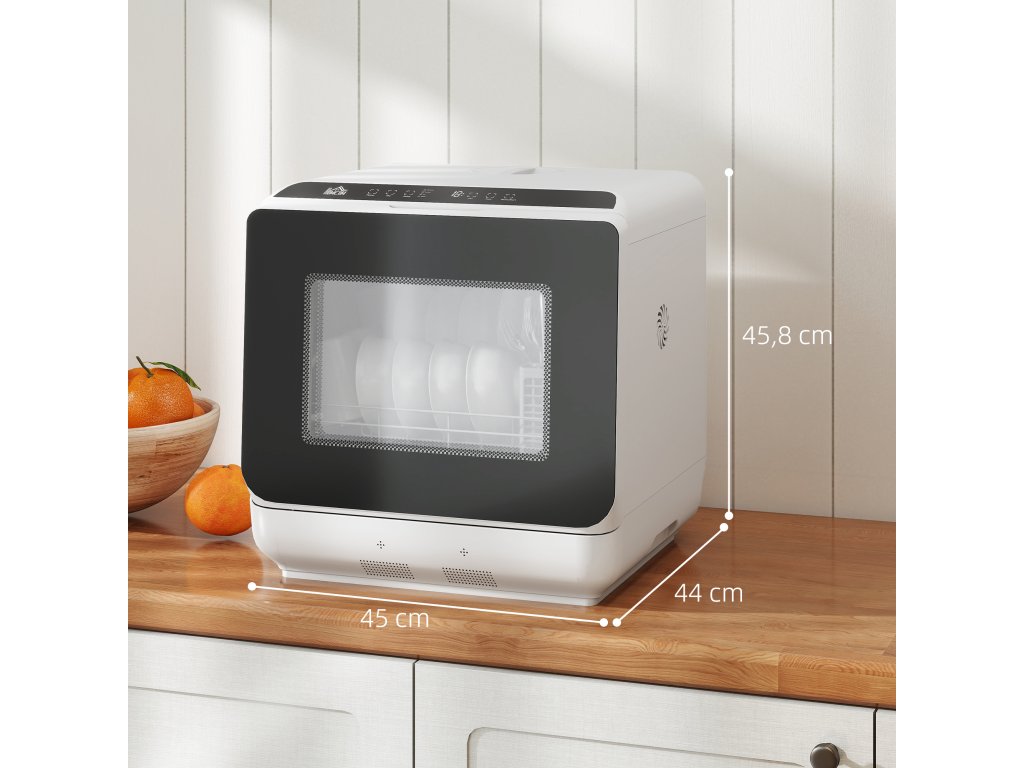 Nebaví vás mýt nádobí po každém jídle? Kompaktní mini myčka nádobí HOMCOM s rychlým 29minutovým programem vám poskytne více času na rodinu a večerní relaxaci! Stolní myčka nádobí je ideální do kuchyně, kanceláře nebo mobilního domu, má prostor až pro nádobí čtyř osob a udržuje vaše pracovní plochy volné. Nevyžaduje připojení k vodovodní síti: jednoduše ji připojte k vodovodnímu kohoutku nebo naplňte nádržku a užijte si mytí bez námahy.