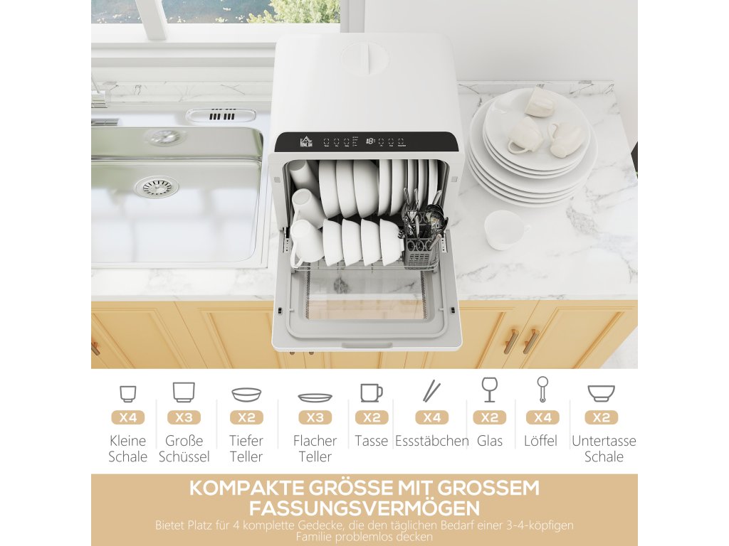 - ✔ Kompaktní design myčky nabízí prostor pro čtyři jídelní soupravy v malých místnostech