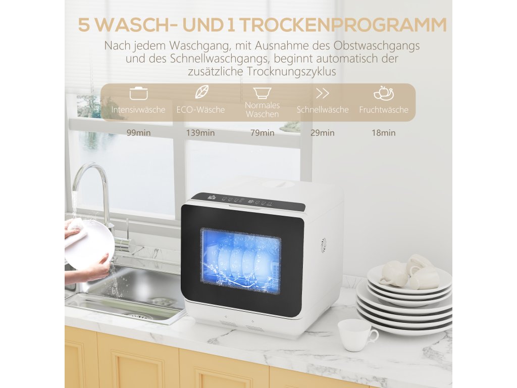 - ✔ Pět mycích programů mini myčky pokryje všechny potřeby, od rychlého až po intenzivní mytí
