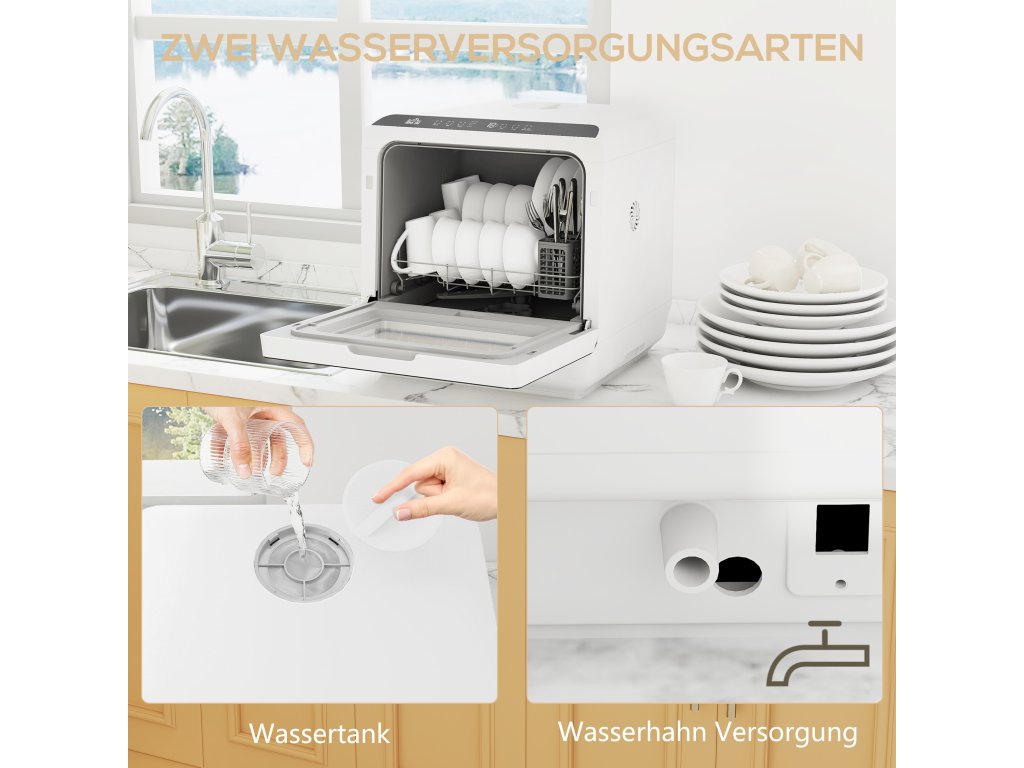 - Flexibilní plnění vodou: Použijte vestavěnou nádrž o objemu 6 litrů nebo spotřebič připojte přímo k vodovodnímu potrubí. Tuto praktickou malou myčku nádobí lze nainstalovat kamkoli bez nutnosti dalšího instalování