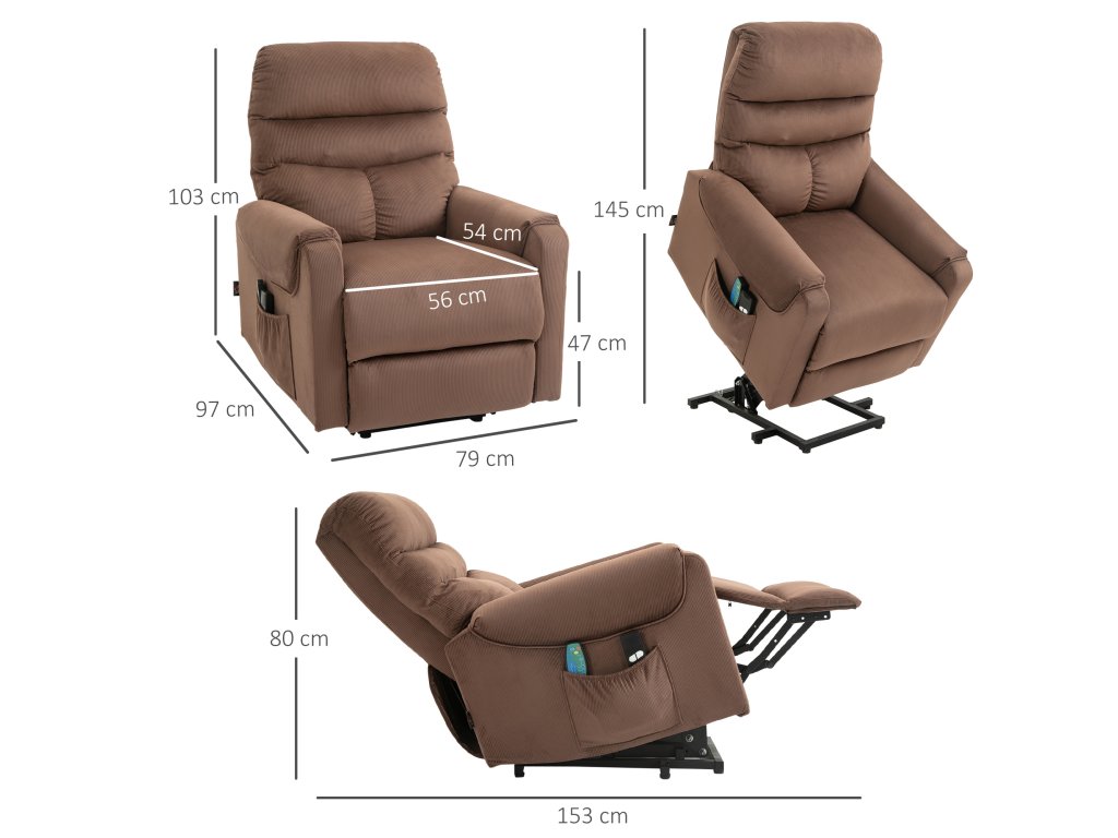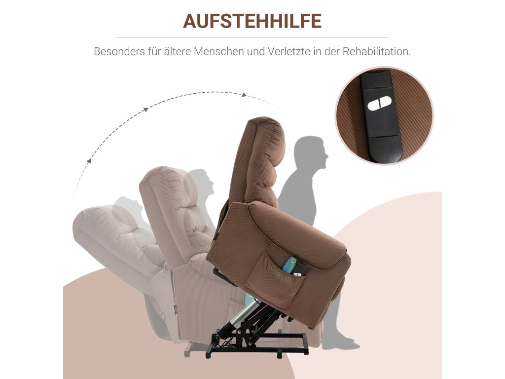 Naše televizní křeslo se stojanem od společnosti HOMCOM je skvělým pomocníkem pro seniory. Pevná konstrukce z odolné oceli vás zvedne z křesla, aniž by se kymácelo, a umožní vám opět jemně a tiše vstát. S 8 vibračními masážními body a vyhřívacími polštářky, které ulevují od bolesti a napětí svalů a zlepšují krevní oběh. Toto elektrické televizní polohovací křeslo od společnosti HOMCOM má vše, co si můžete přát.