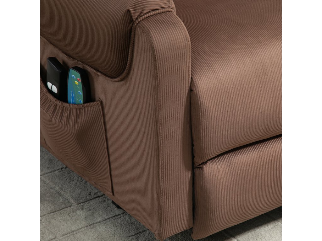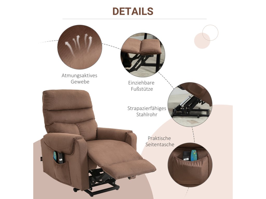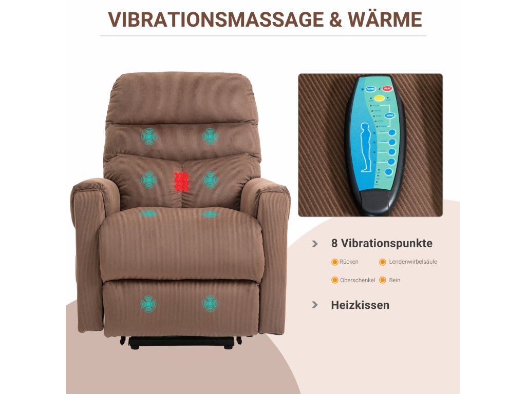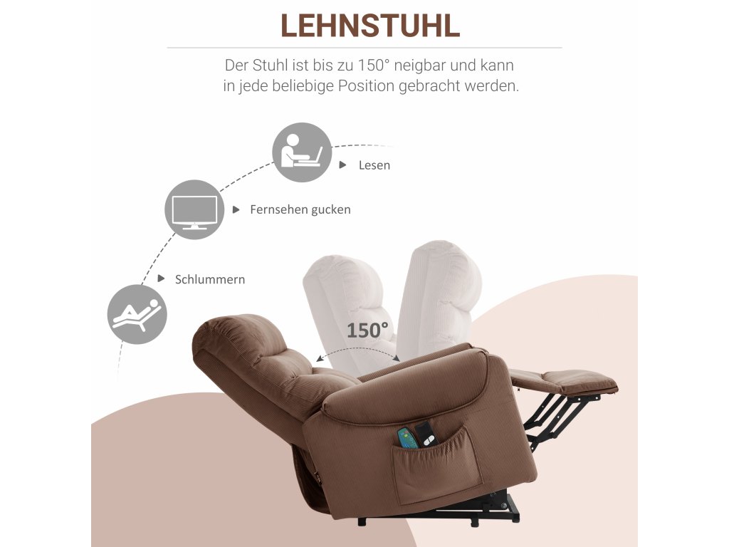 HOMCOM TV křeslo se stojánkem elektrické, masážní křeslo s funkcí polohování a vyhřívání, polohovací křeslo s dálkovým ovládáním a boční kapsou nastavitelné polyesterová tkanina hnědá