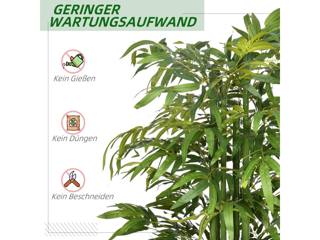 Nemáte zelené prsty, ale milujete svěží zeleň? Náš umělý bambus je pro vás ideálním řešením! Tato rostlina zůstává trvale zelená a nevyžaduje žádné stříhání ani tvarování. Zapomeňte na zalévání a hnojení - náš umělý bambus je nenáročný na údržbu a bezstarostný, ideální pro zaneprázdněné nebo cestující milovníky rostlin. Klamavě skutečné listy dodají každé místnosti živou, přirozenou atmosféru. Krásný umělý bambus je již dodáván v květináči.
