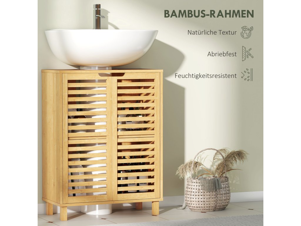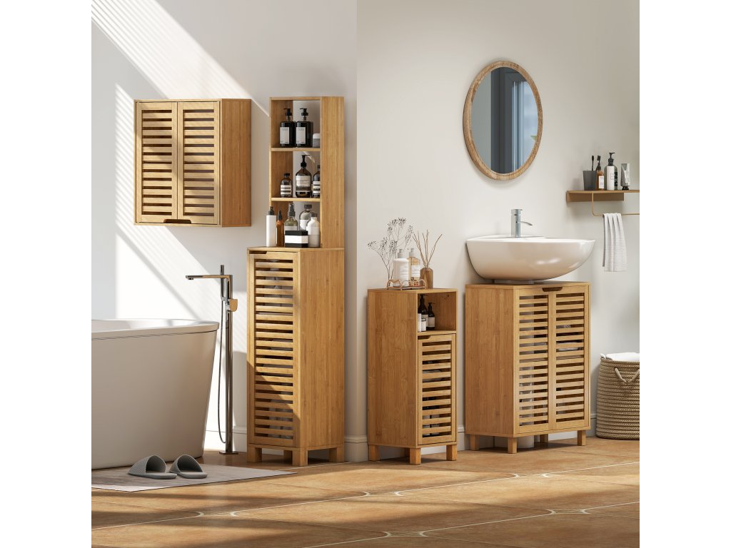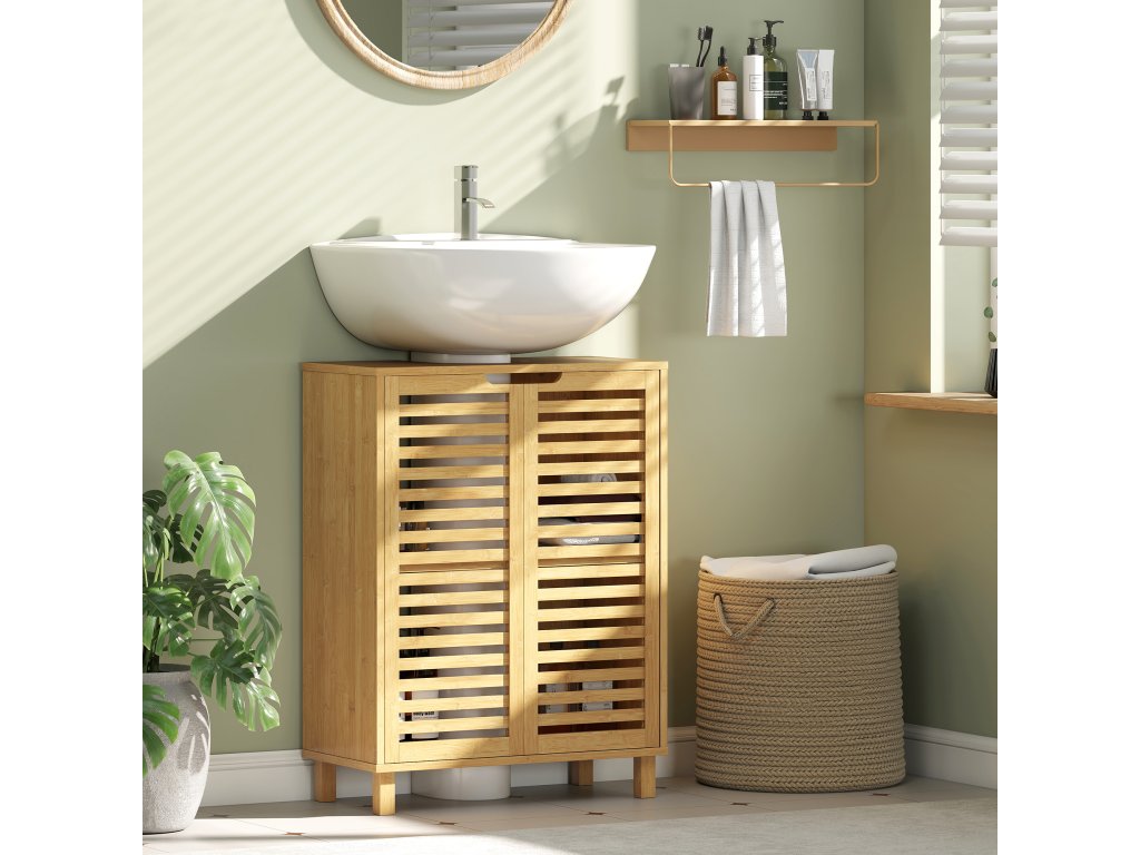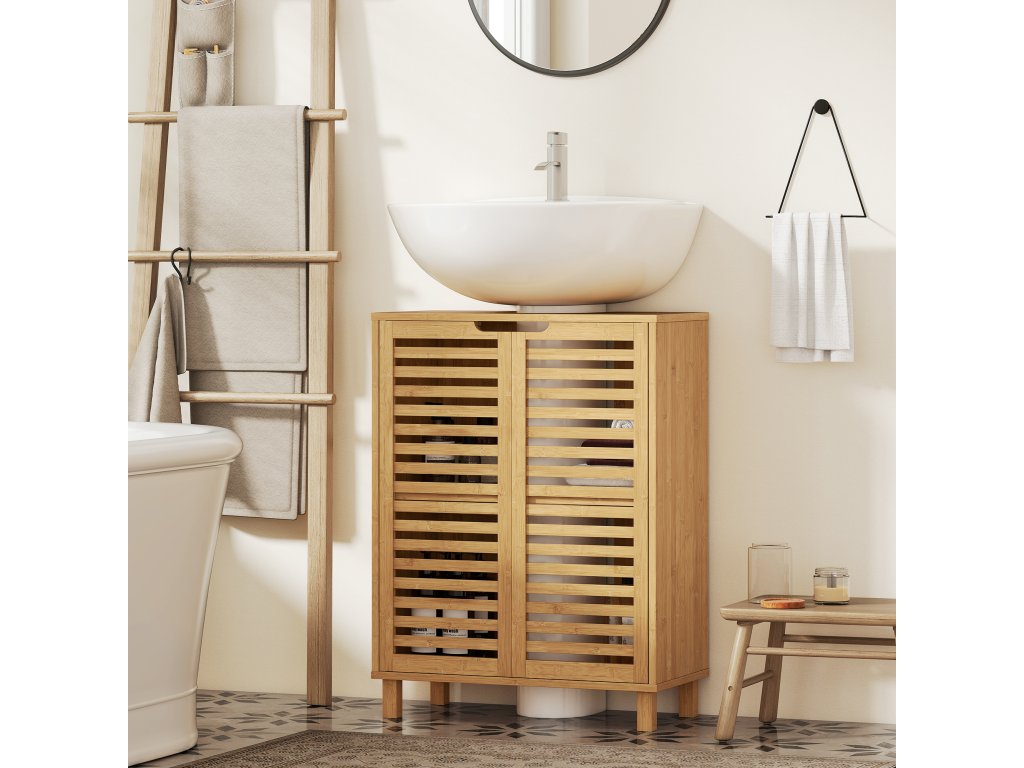HOMCOM Umyvadlová skříňka do koupelny, koupelnová skříňka se žaluziovými dvířky, bambusové dřevo, nastavitelné police, přírodní barva