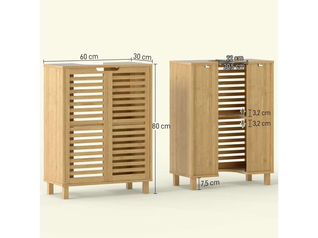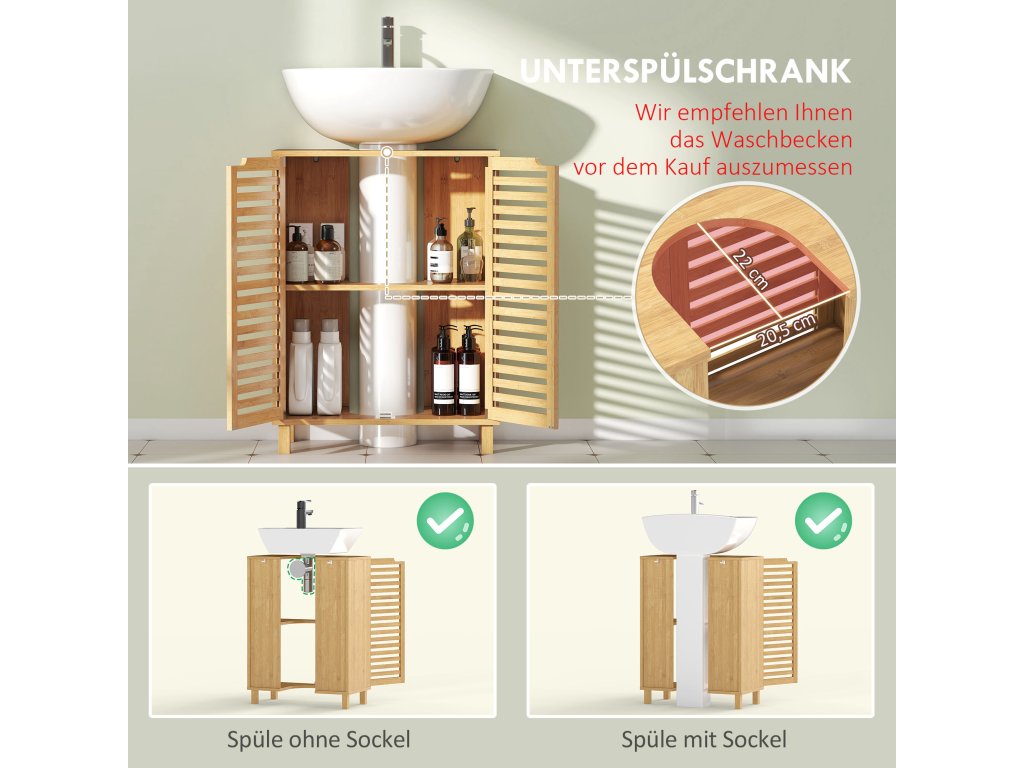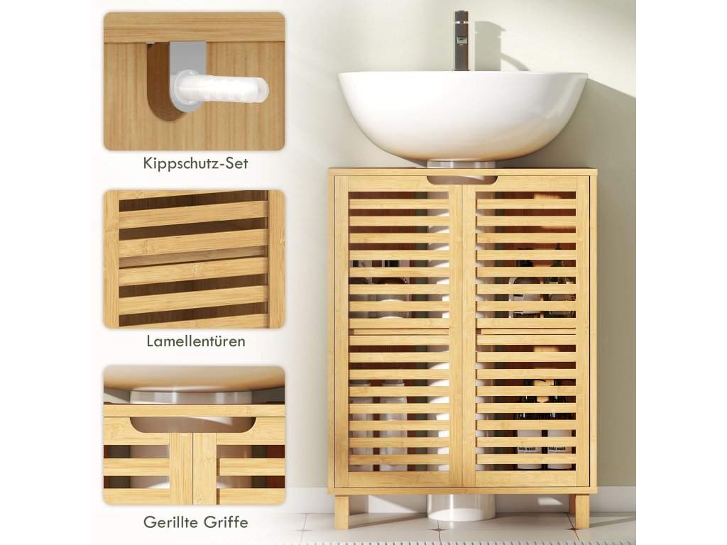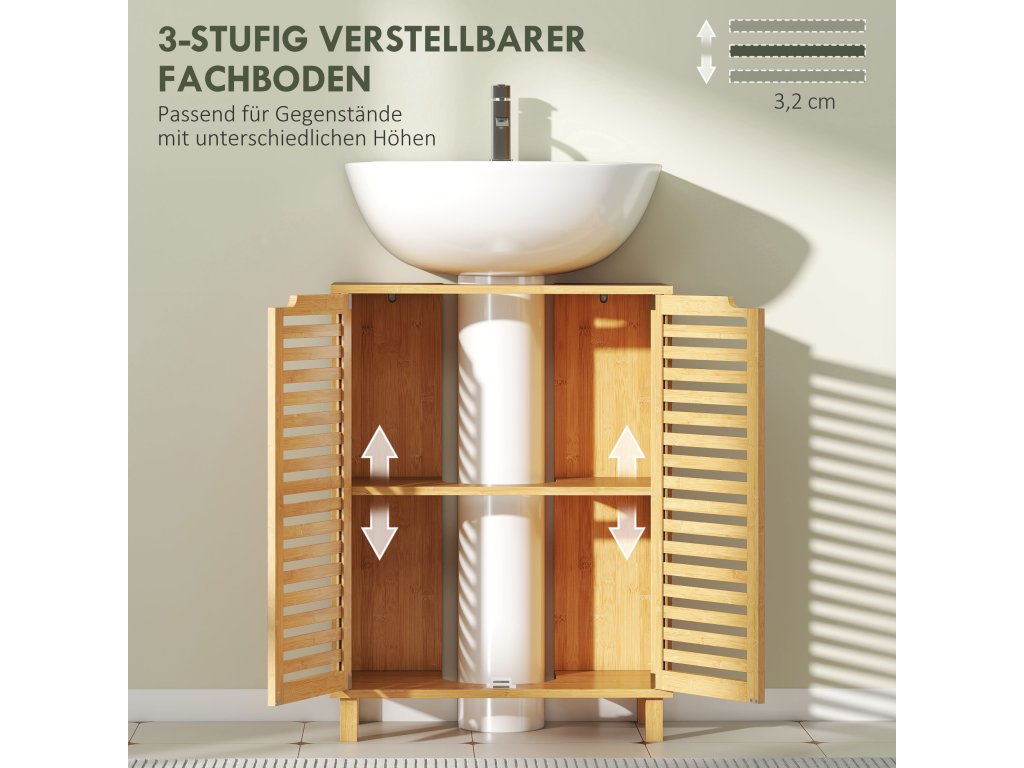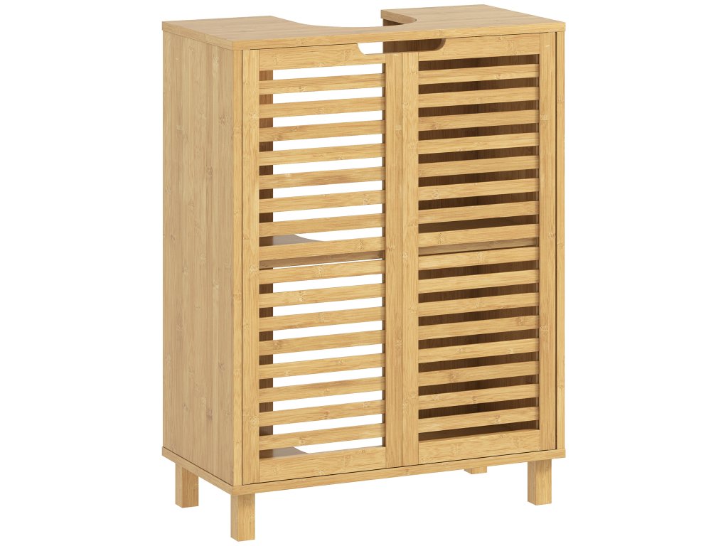 HOMCOM Umyvadlová skříňka do koupelny, koupelnová skříňka se žaluziovými dvířky, bambusové dřevo, nastavitelné police, přírodní barva