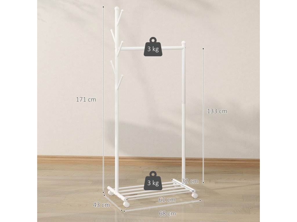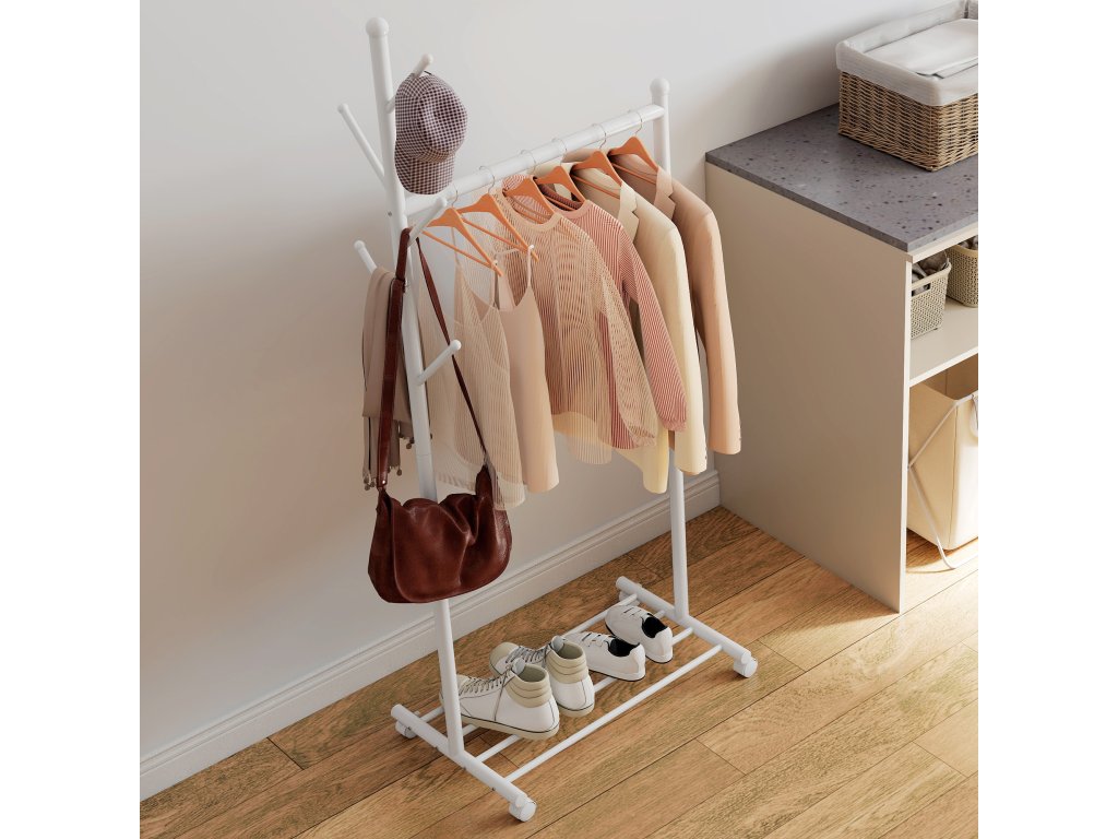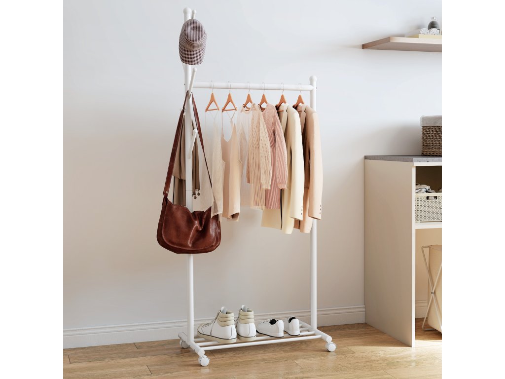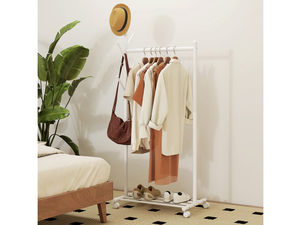 HOMCOM Věšák na kabáty s kolečky, pojízdný věšák s tyčí na šaty, 5 háčků, stojan na boty bílý